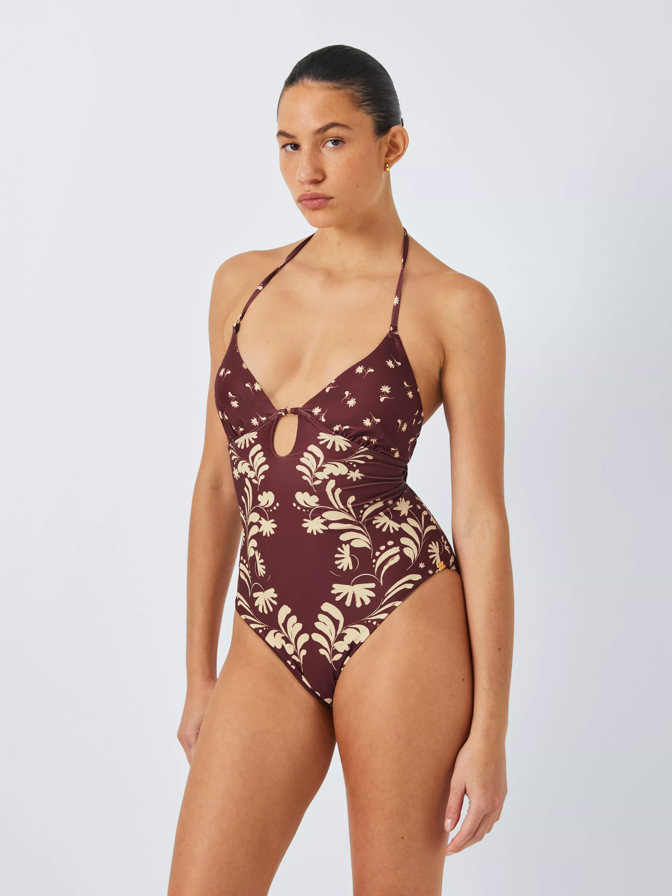 This swimsuit is cut with a wide V and keyhole front to show off your decolletage. An oversized bow at the back is an extra surprising addition.