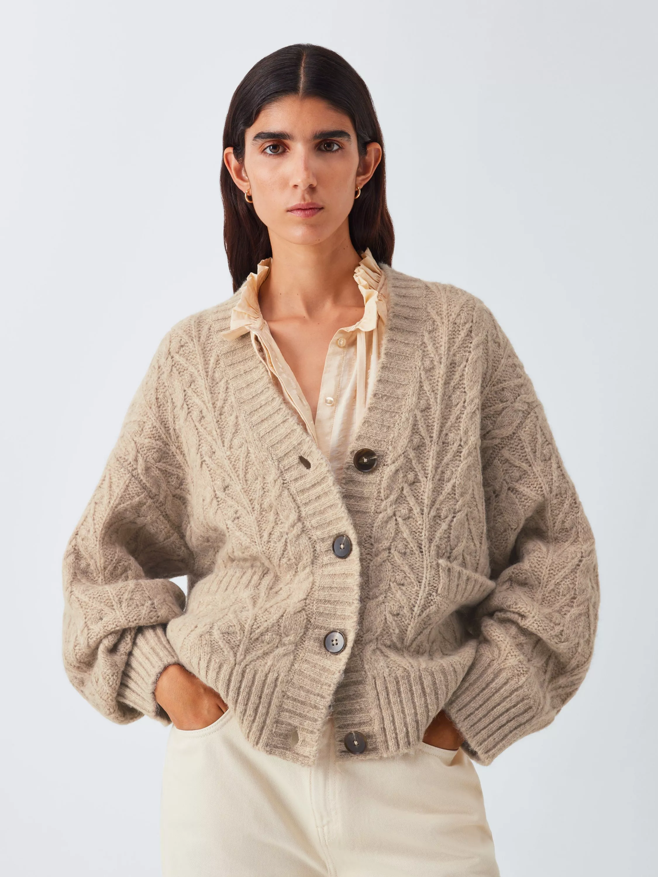 A blended fabric consisting largely of alpaca and wool provides the base for a cable knit structure that cements this cardigan's aesthetic credentials.