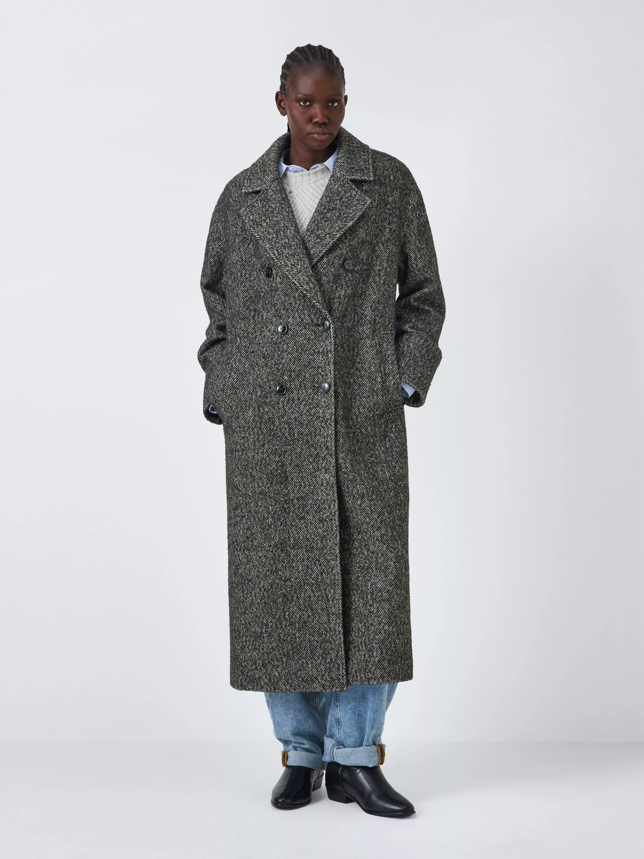 A staple for colder days and nights, this stylish coat instantly flatters with its longline cut and classic herringbone design.