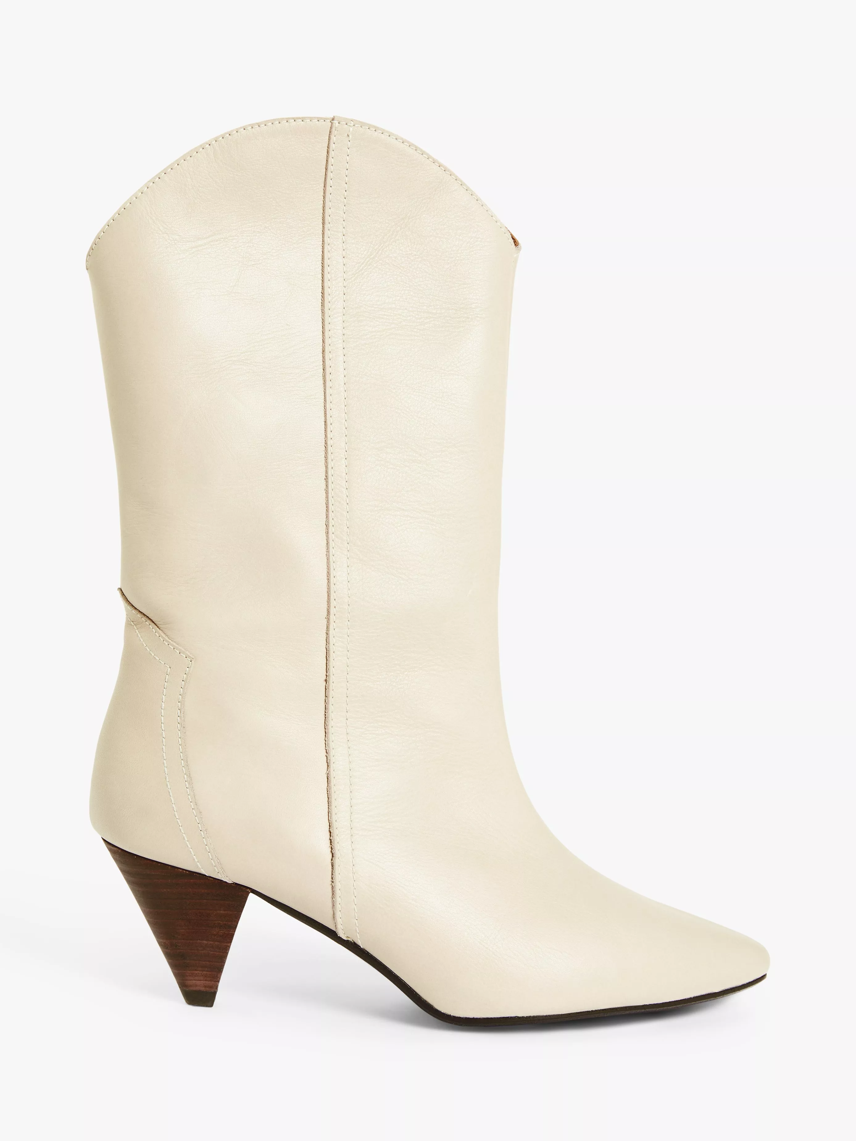 A contemporary design with soft Western inspiration, these boots have been made in Spain from high-quality leather and feature a soft elegant rounded almond toe with a stacked cone heel.