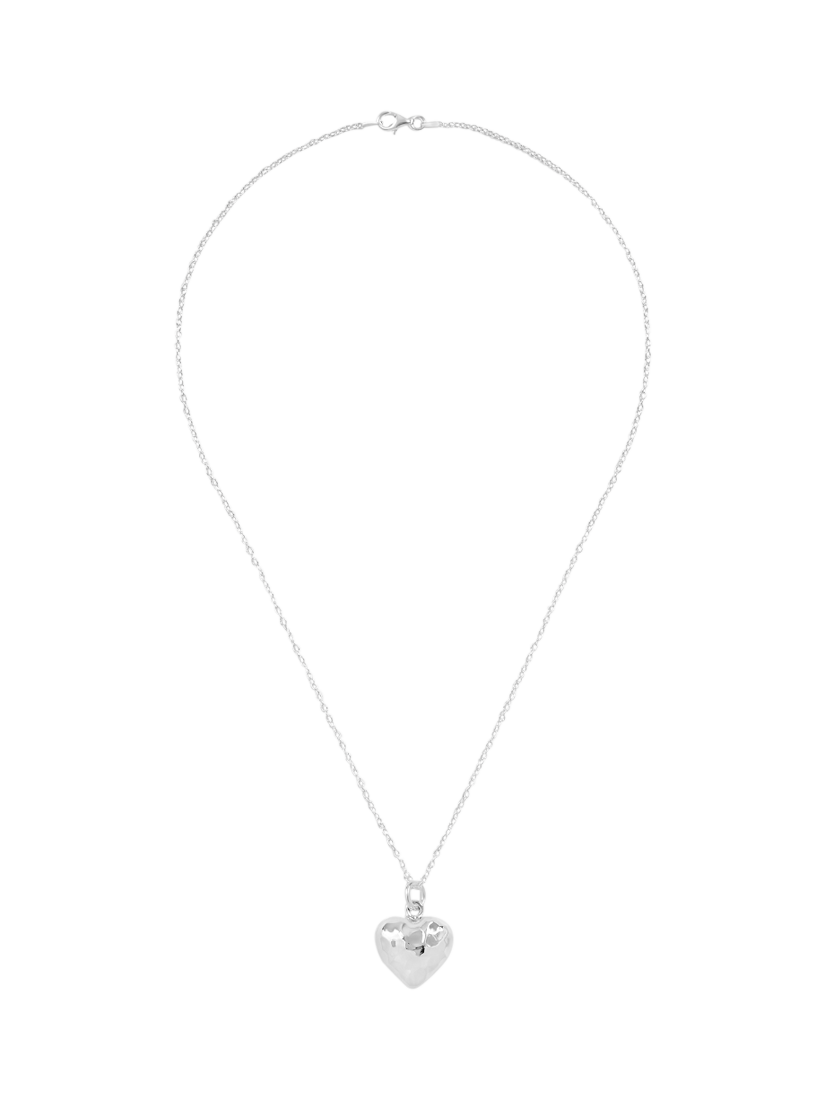 A shimmering hammered puffed heart pendant hangs prettily on a silver link chain.