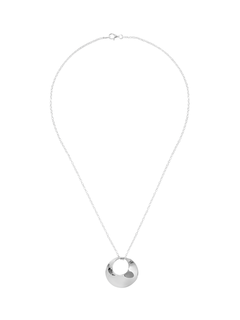 A stunning and eye-catching sculptural pendant necklace. This design is inspired by the Mobius ring. Hung on a simple link chain which show cases the sculptural design elegantly.