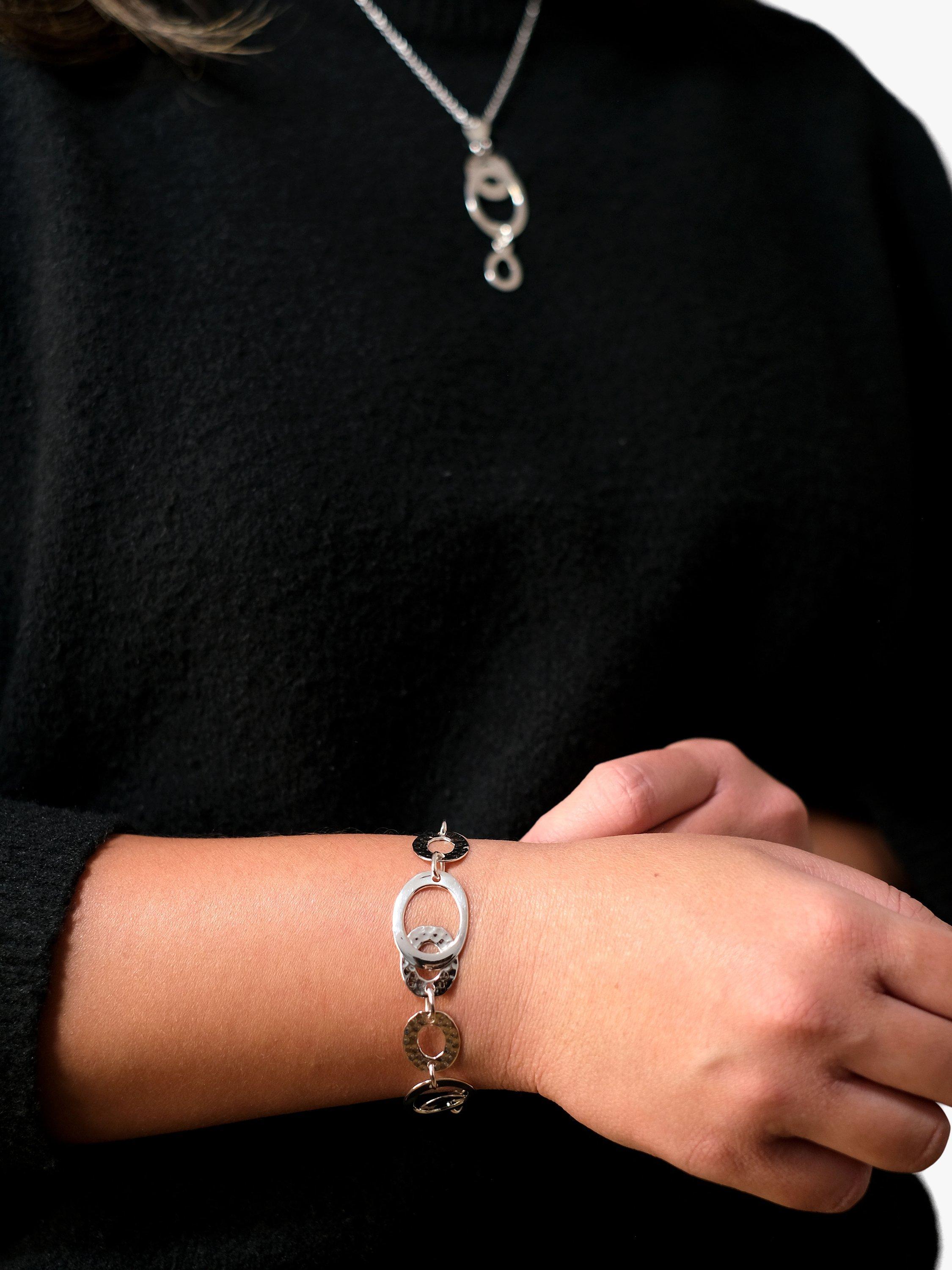 A beautiful art deco bracelet with a modern hammered shimmer. Finished off with a t-bar fastening.