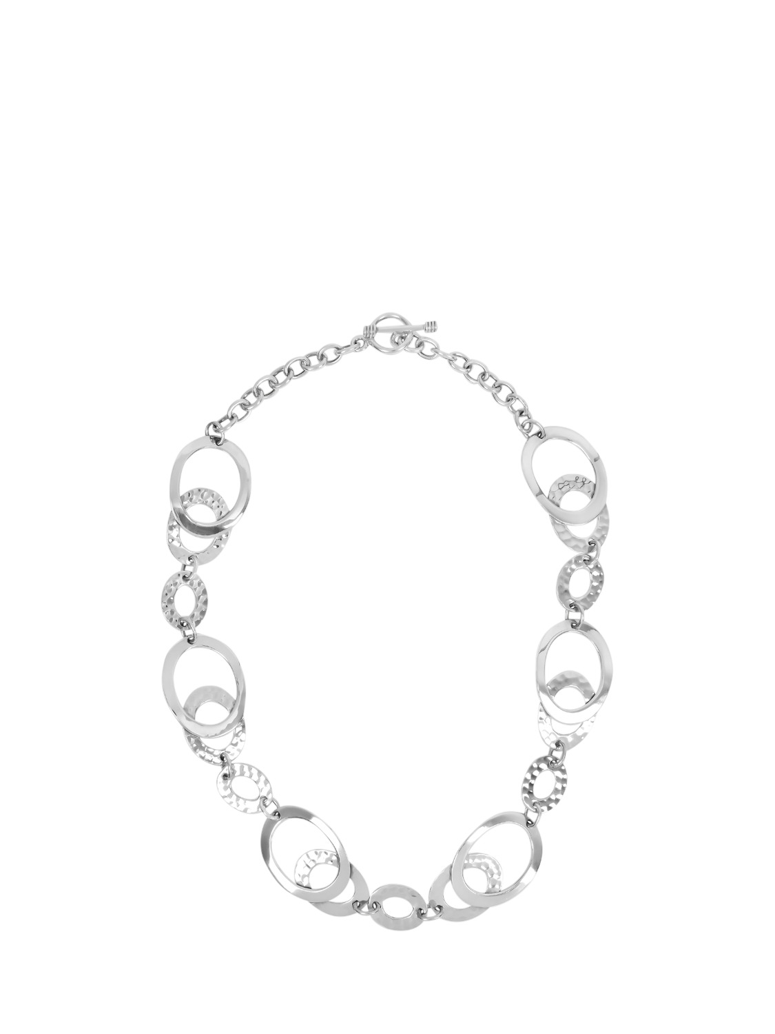 Inspired by an Art Deco design, this shimmering piece of smooth open oval rings juxtaposed against hand hammered rings exudes a lovely quality.