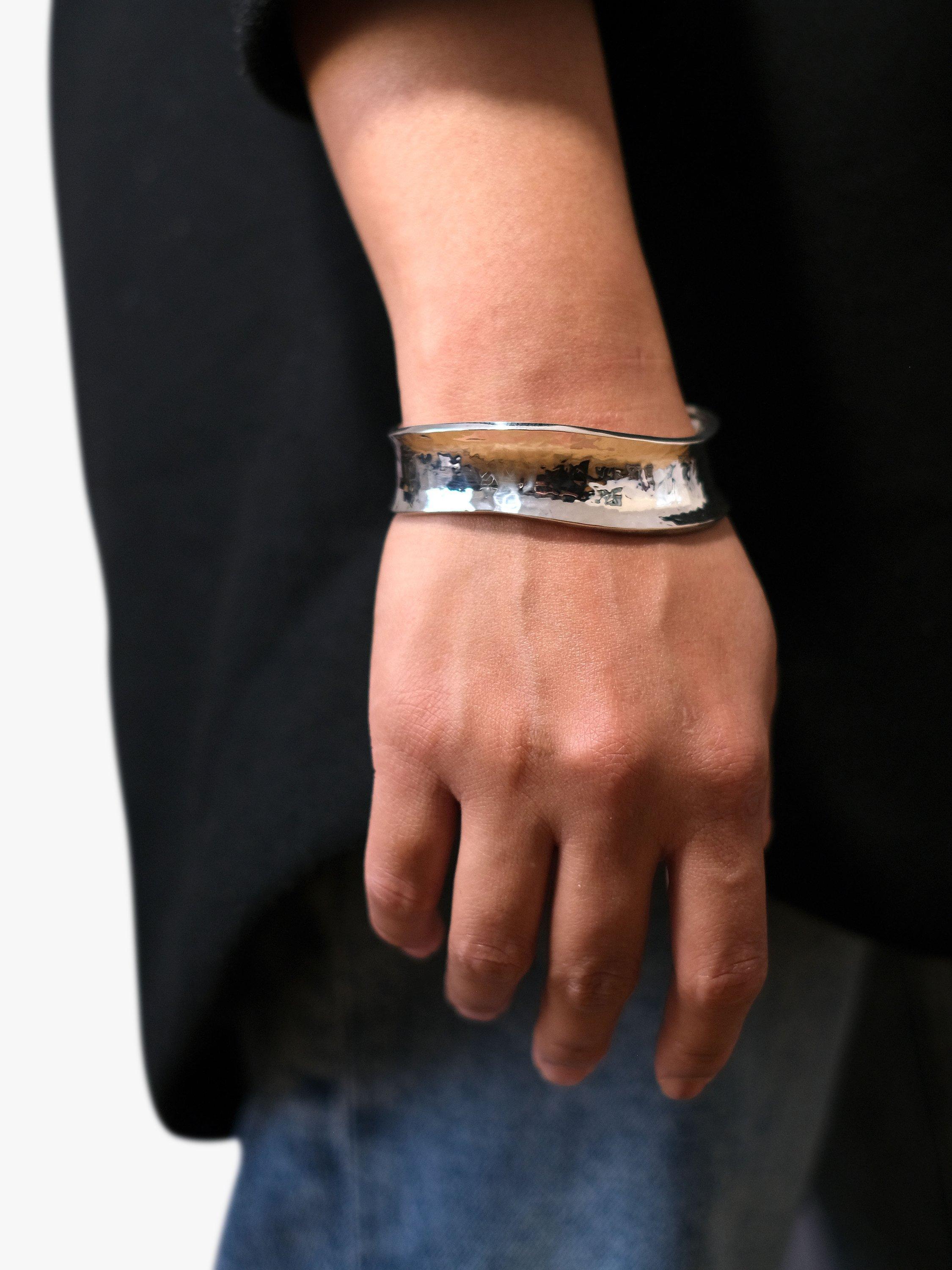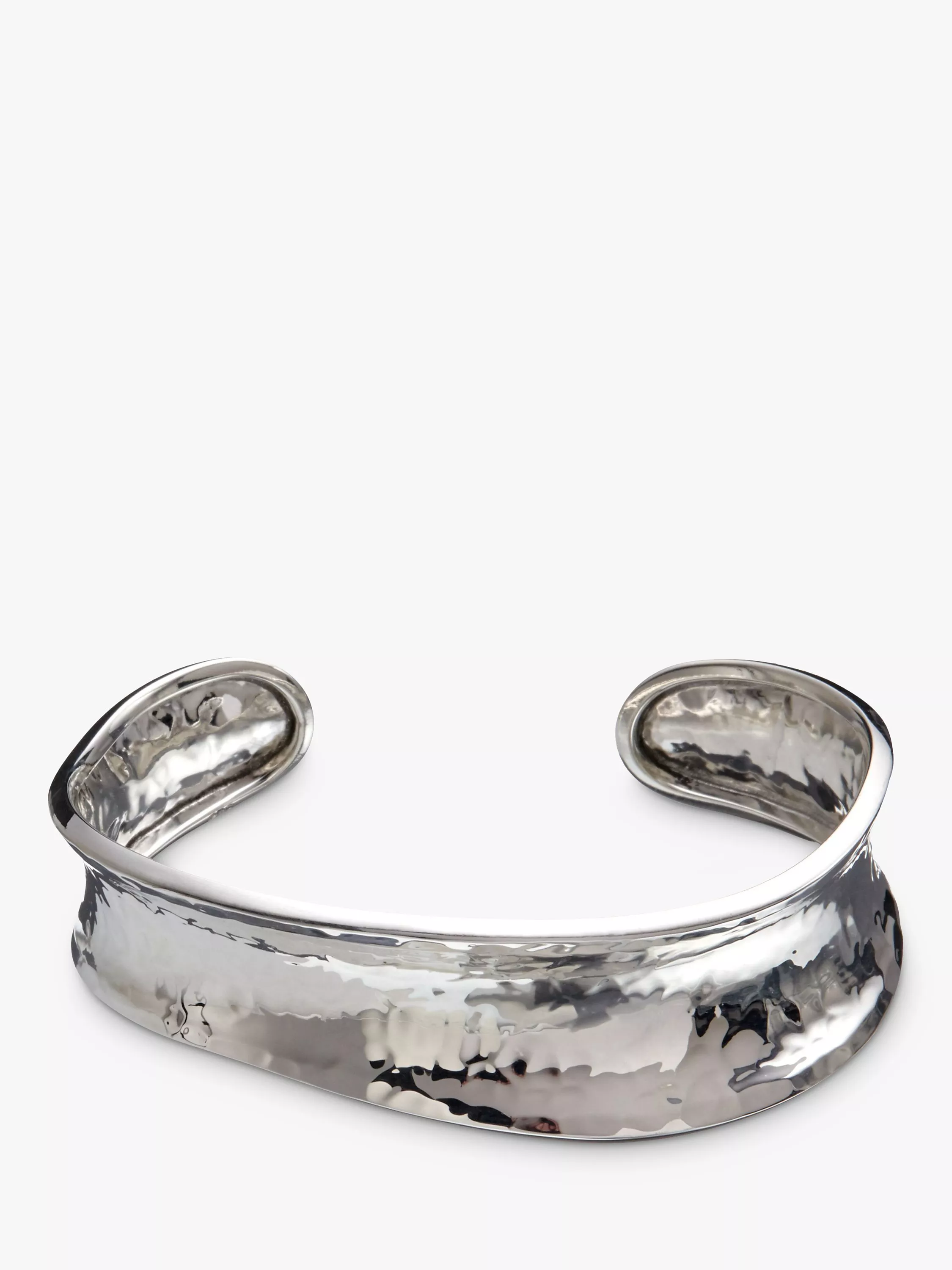 A modern piece of sterling silver jewellery, the design features an open-end fit and an all-over hammered finish that adds texture to the look. The fashionable piece will stand out on sleeveless or cropped-sleeve ensembles.
