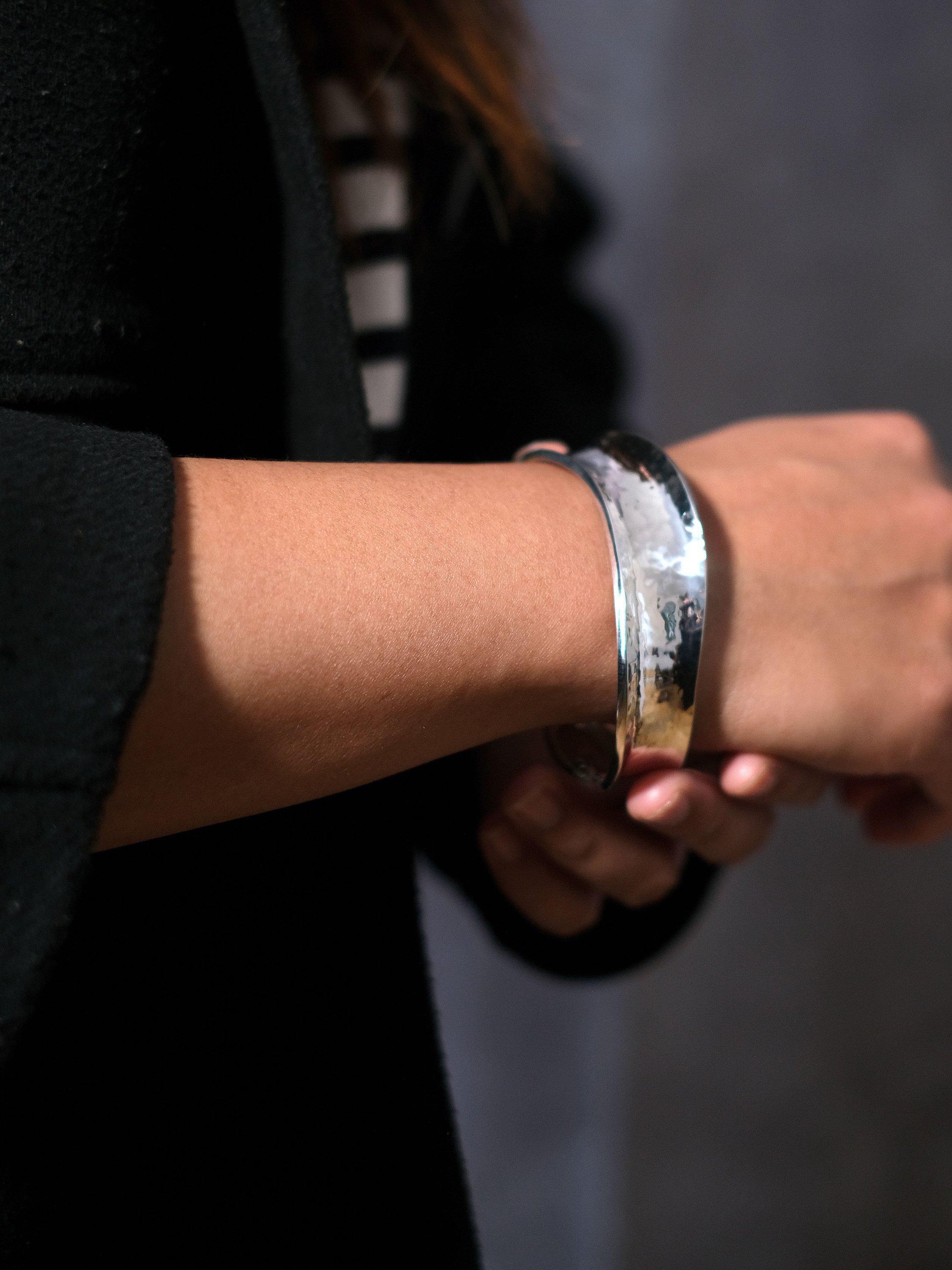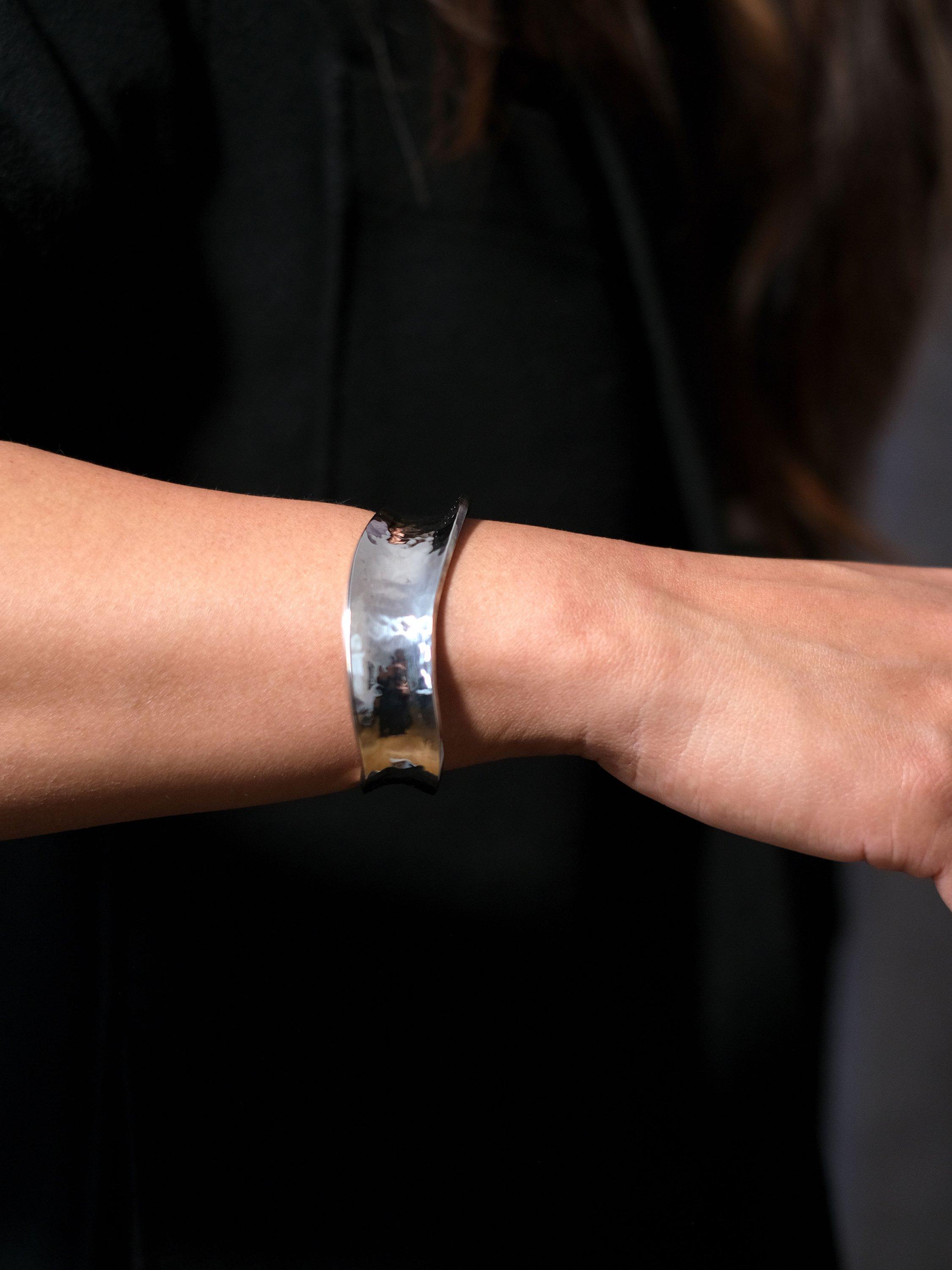 Opt for this fashion-forward concave cuff by Andea.