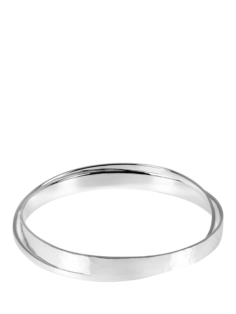 The must-have accessory features two intertwined bangles in different widths made from sterling silver. The thin bangle comes in a lustrous polished finish, while the wide one offers a hammered styling for more texture.