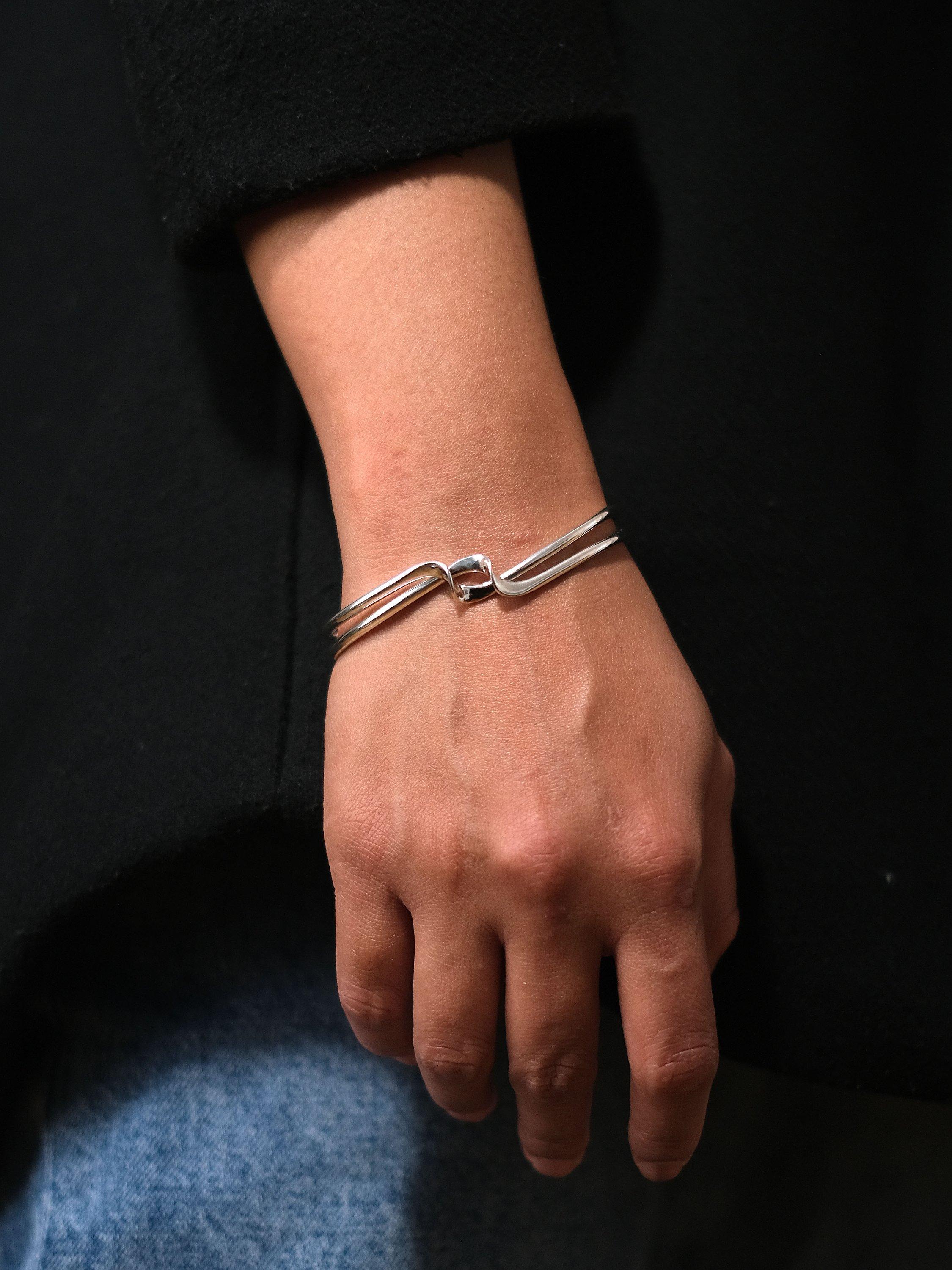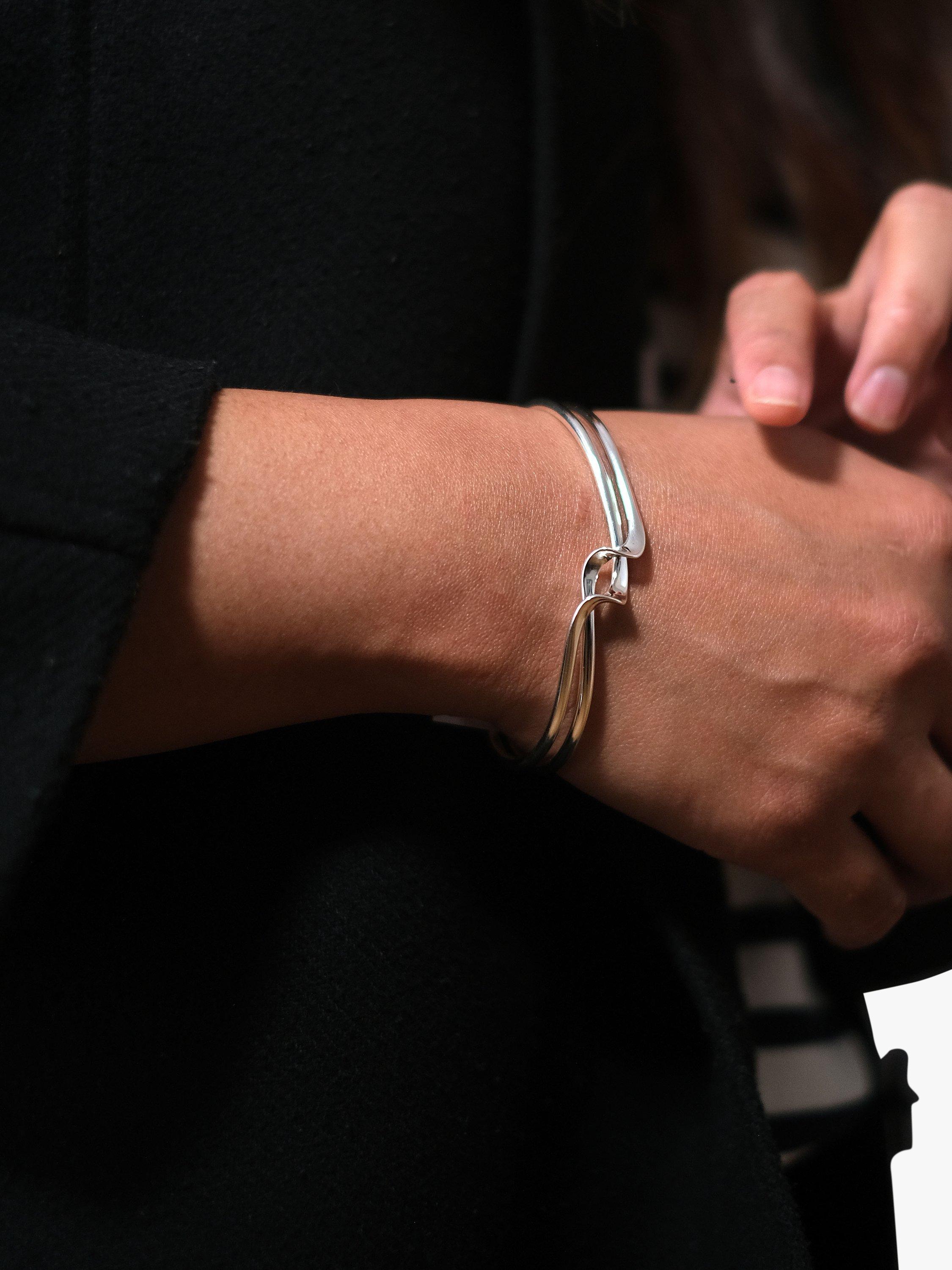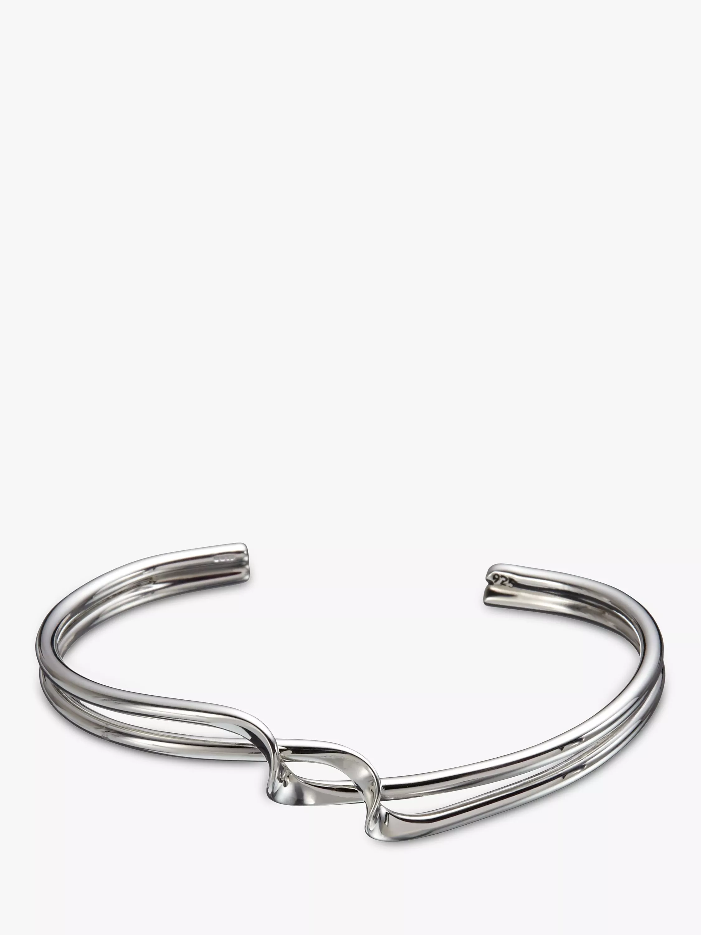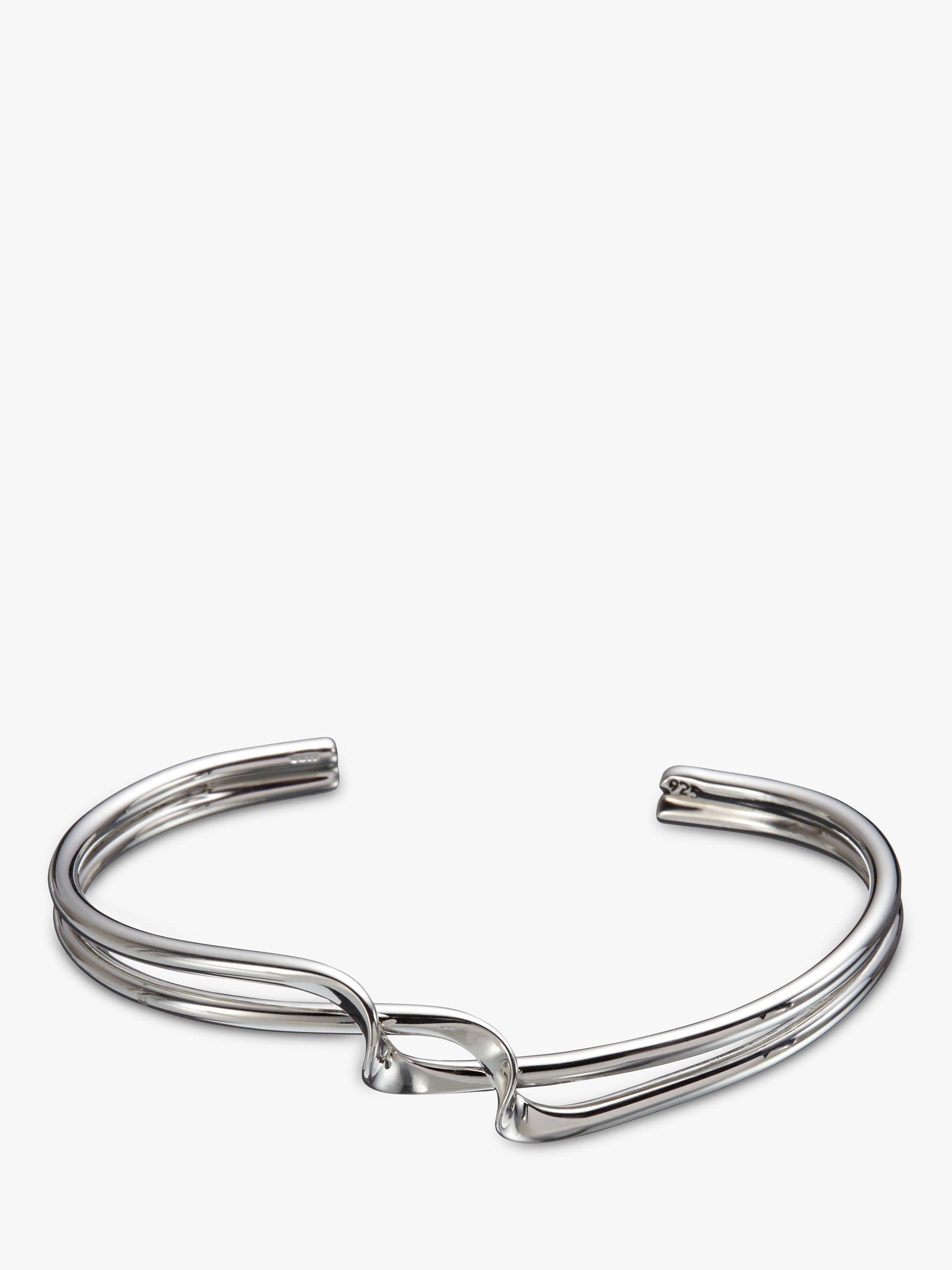 Crafted from sterling silver, the design features an open-end fitting that will seamlessly adapt to the wrist and boasts a beautiful twist detailing at the front.