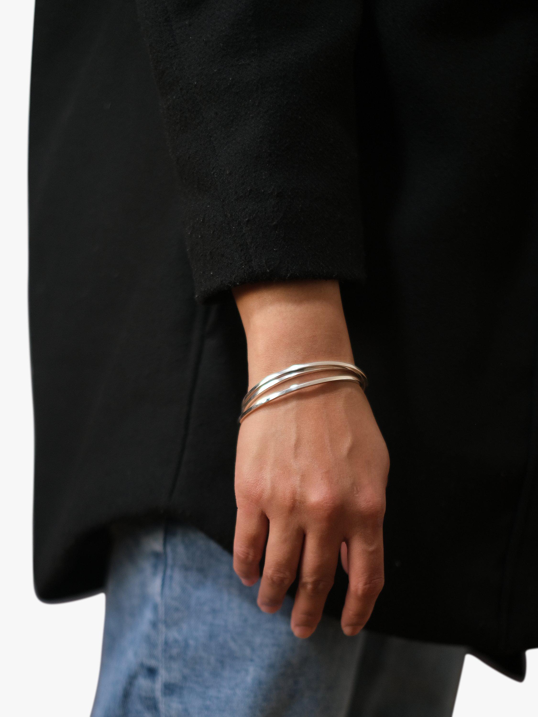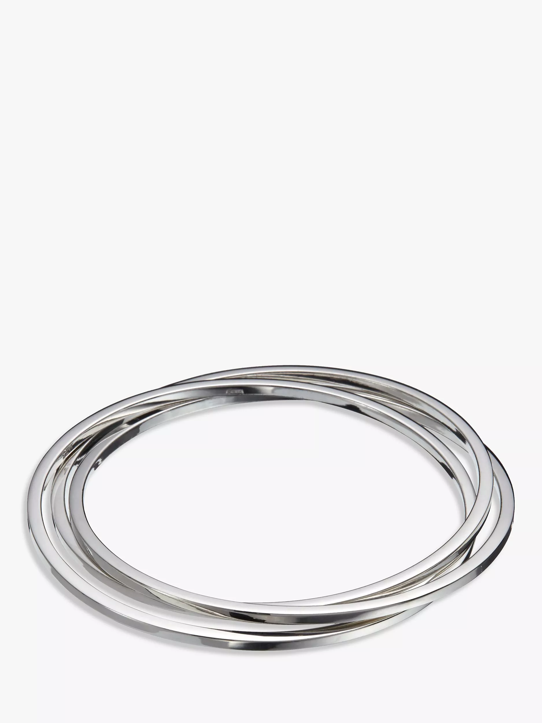 Featuring a solid sterling silver design, the minimalist accessory intertwines three square-edged tube bangles that create a nonchalant and edgy finish.
