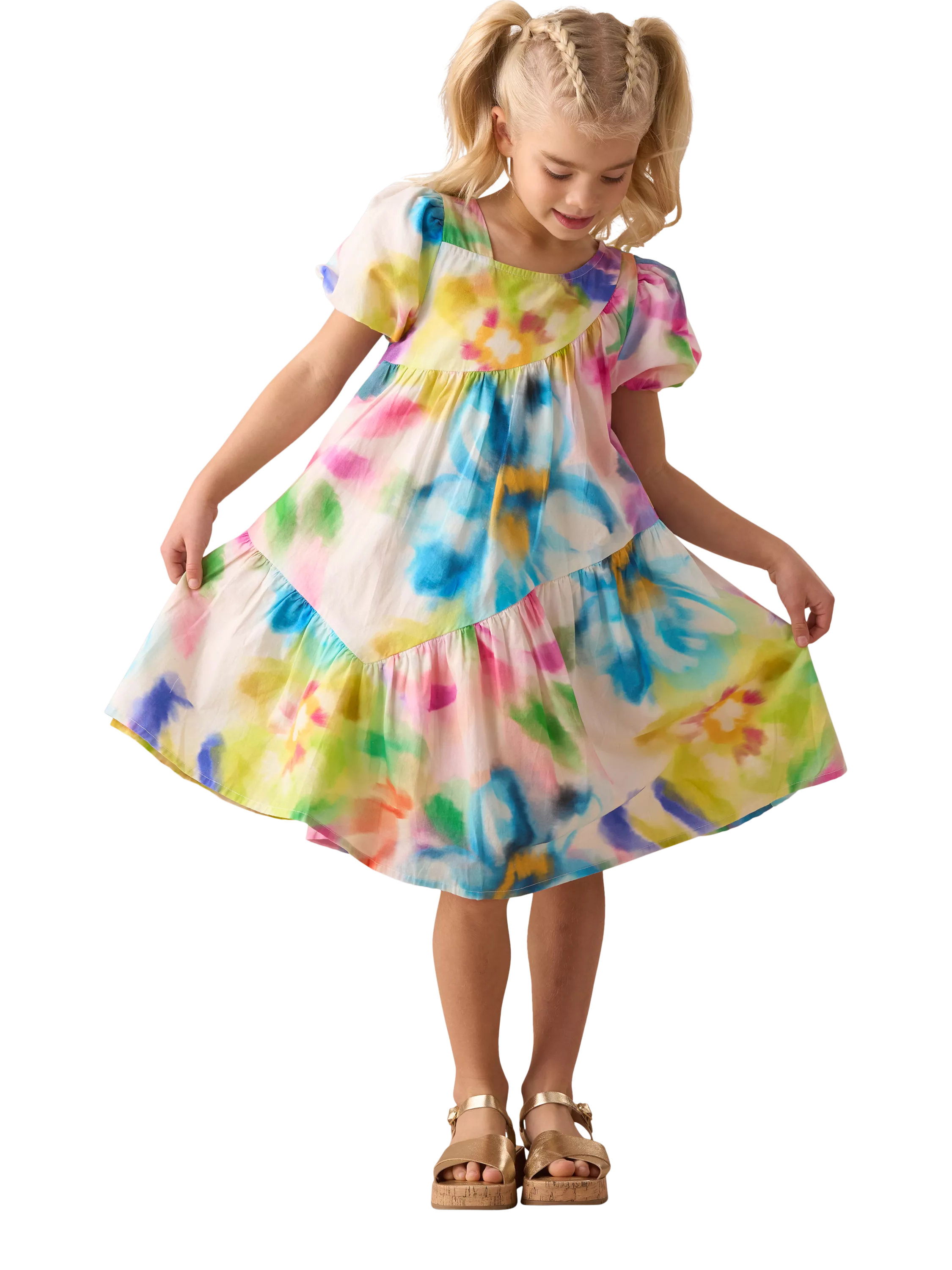 If your little one has a 'colourful' personality then she's going to love this dress! A vibrant multicolour dress in a fun and bold print with an asymmetric design and pretty puff sleeves.