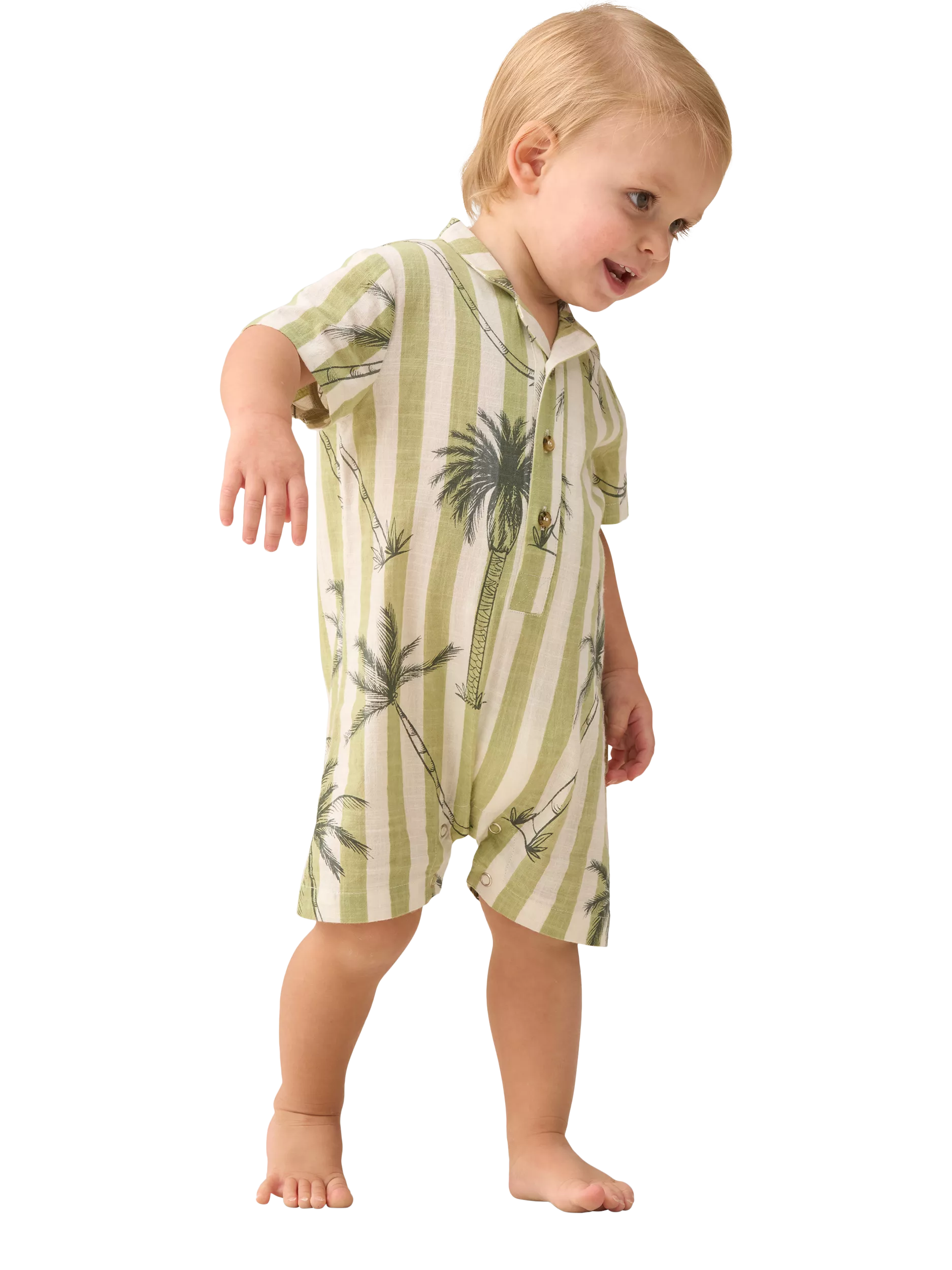This lightweight cotton romper features a playful stripe and palm tree print, perfect for sunny days. With a breezy resort collar, it's ideal for keeping little ones cool and stylish.