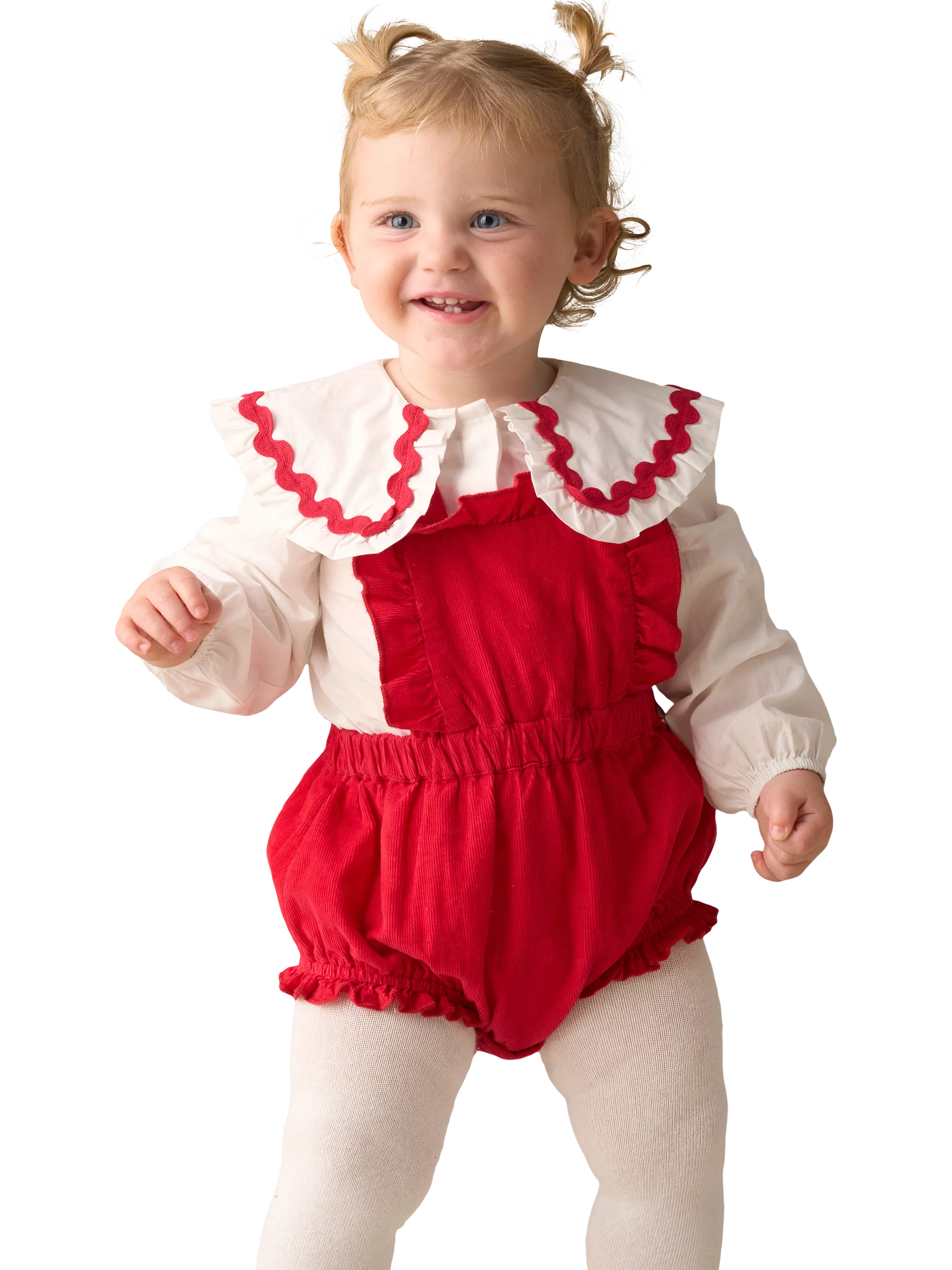 This charming red cord romper comes paired with a crisp white blouse, featuring an oversized collar trimmed with playful red ric-rac. A timeless outfit perfect for special occasions or picture-perfect moments.