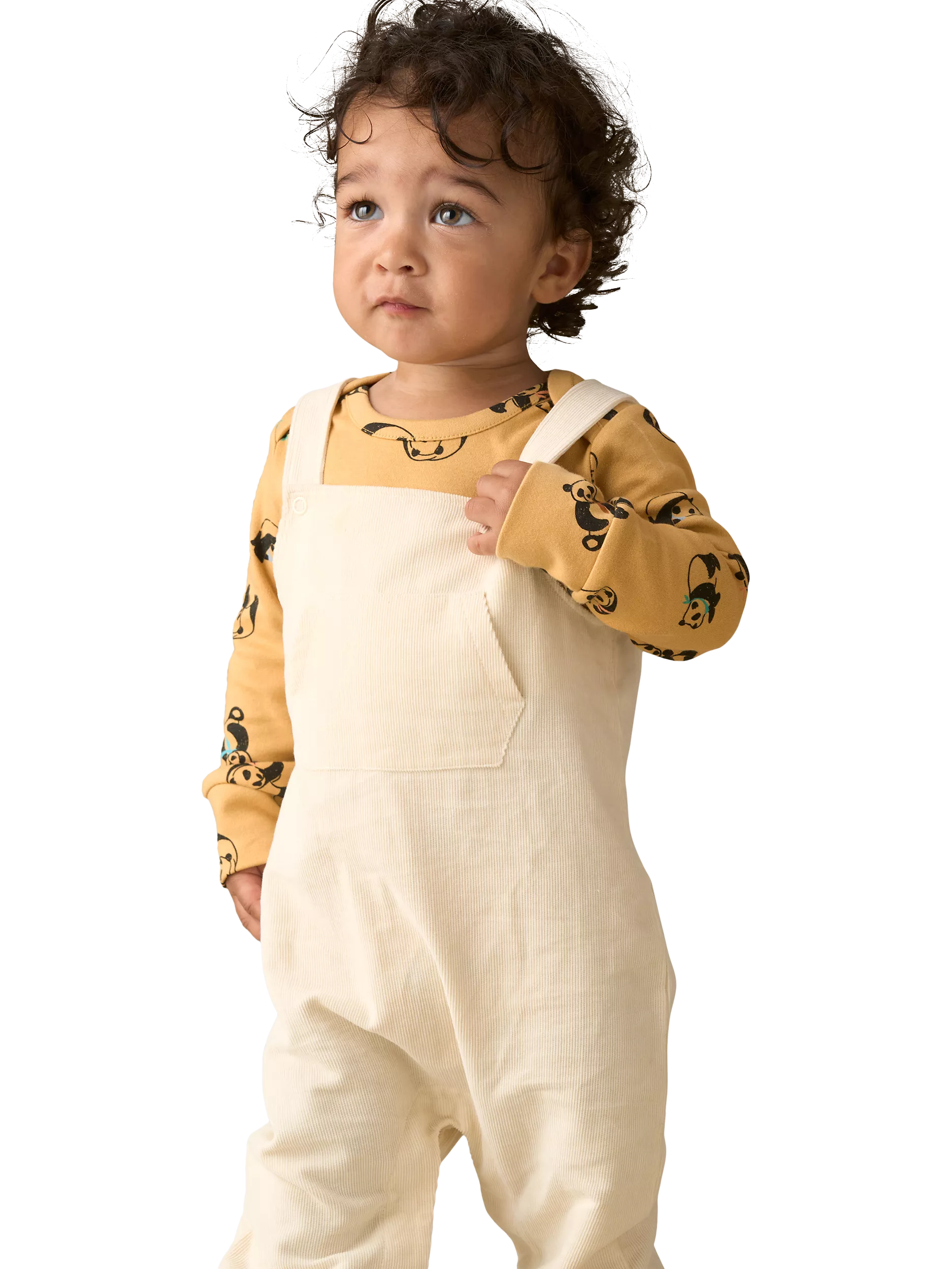 This dungaree set, features soft stone cord dungarees layered with an adorable yellow panda print top. The popper opening on the legs makes for easy changing while the adjustable straps ensure the perfect fit.