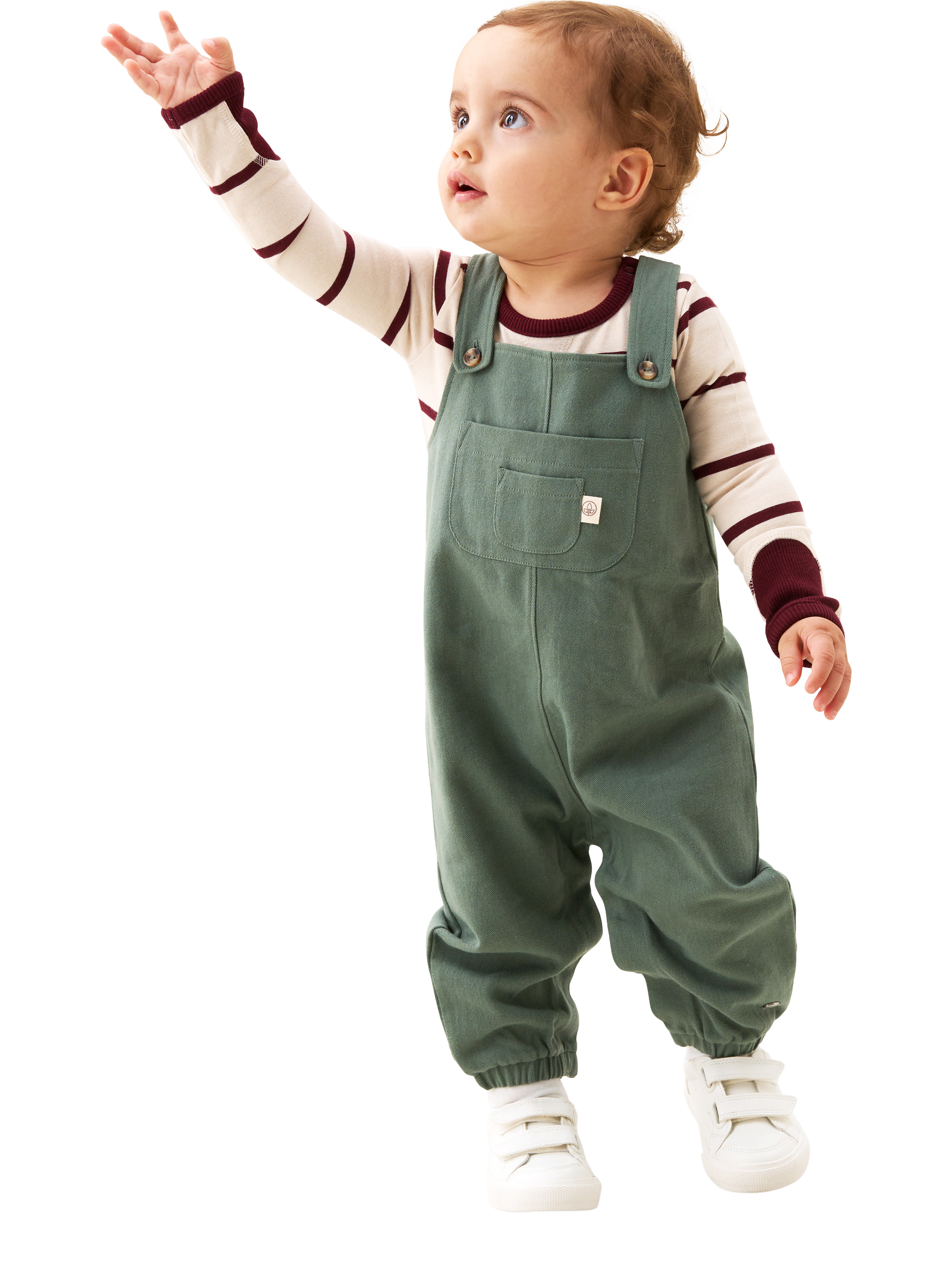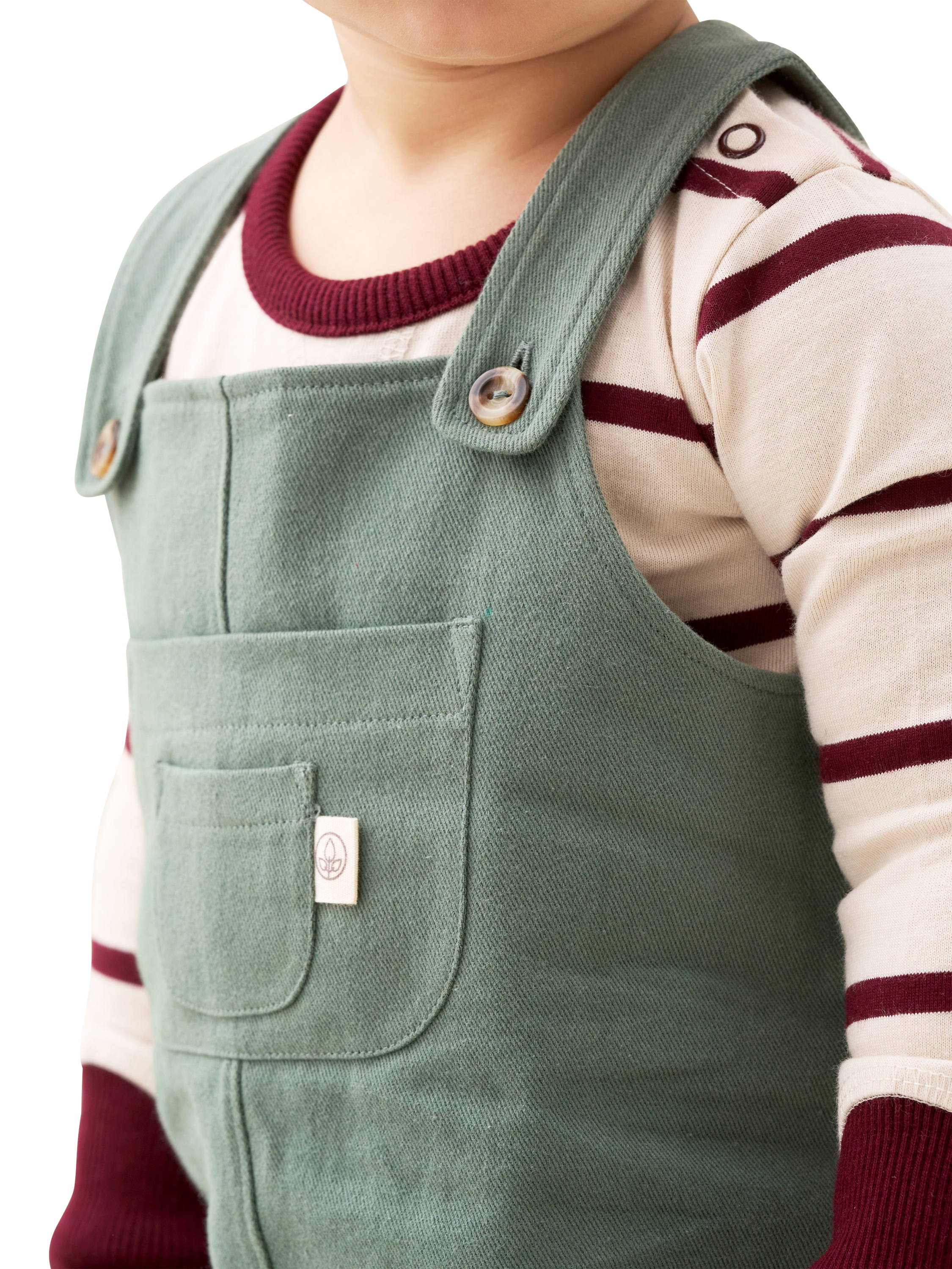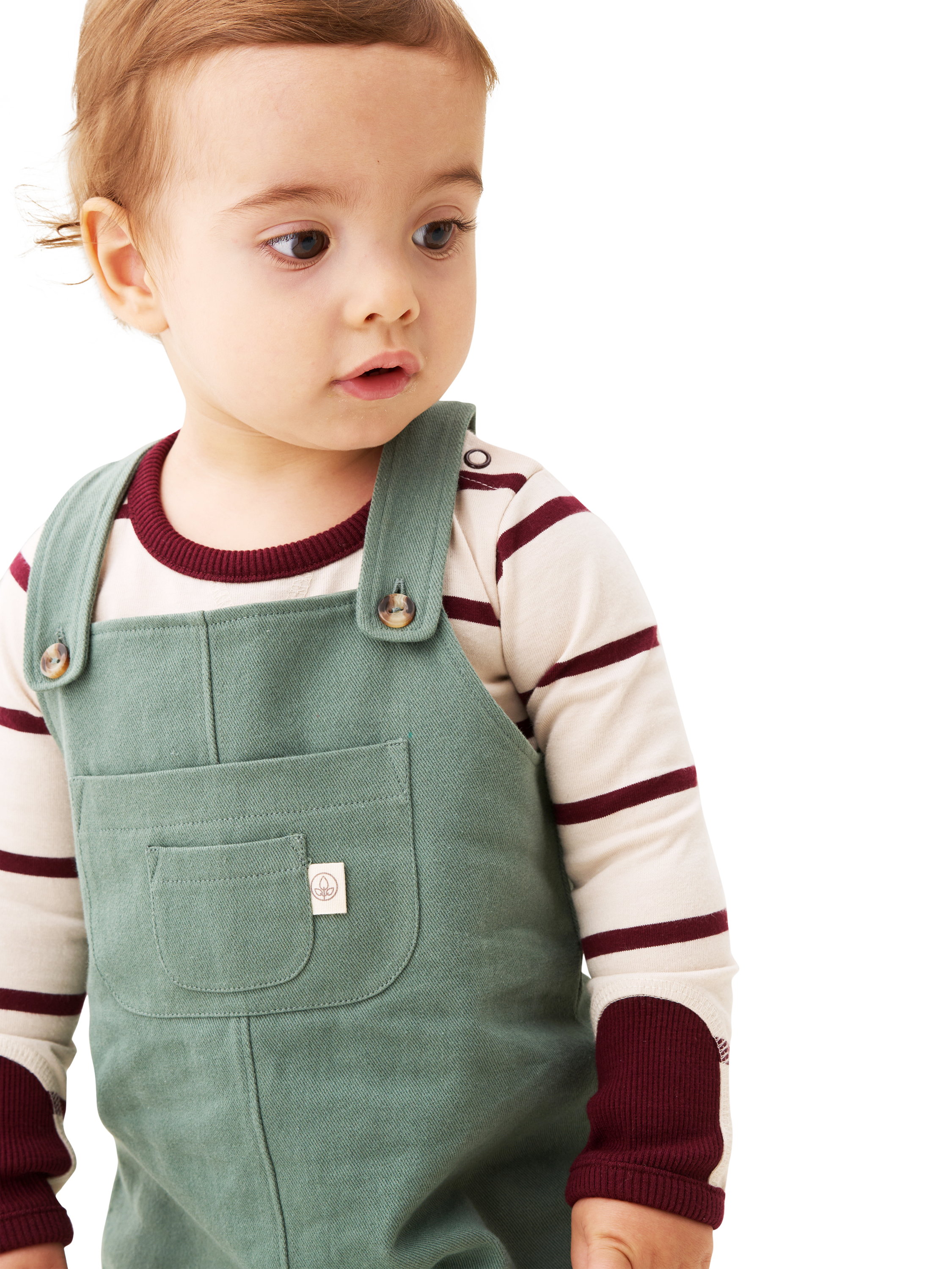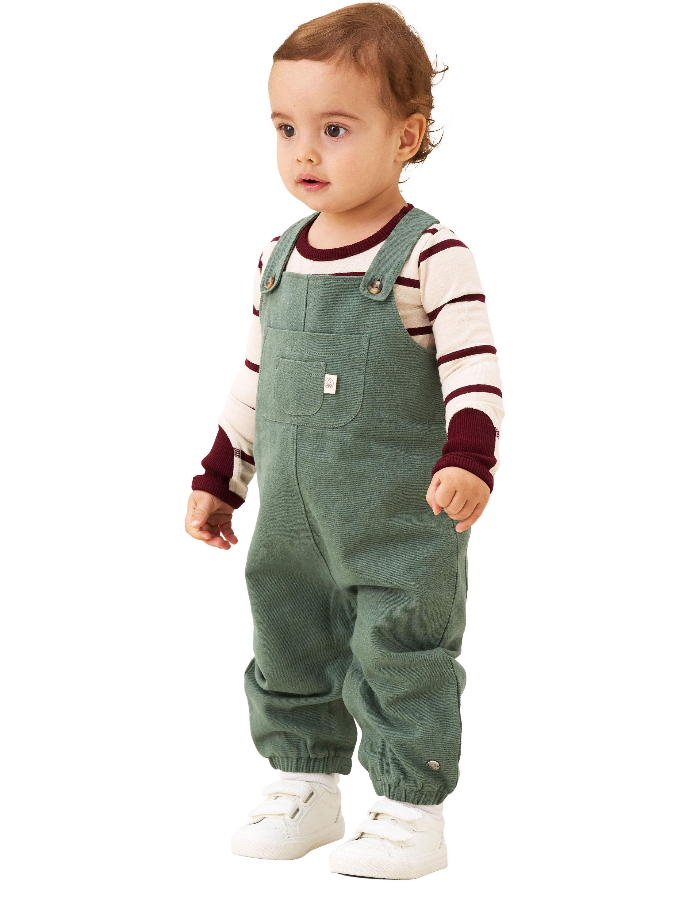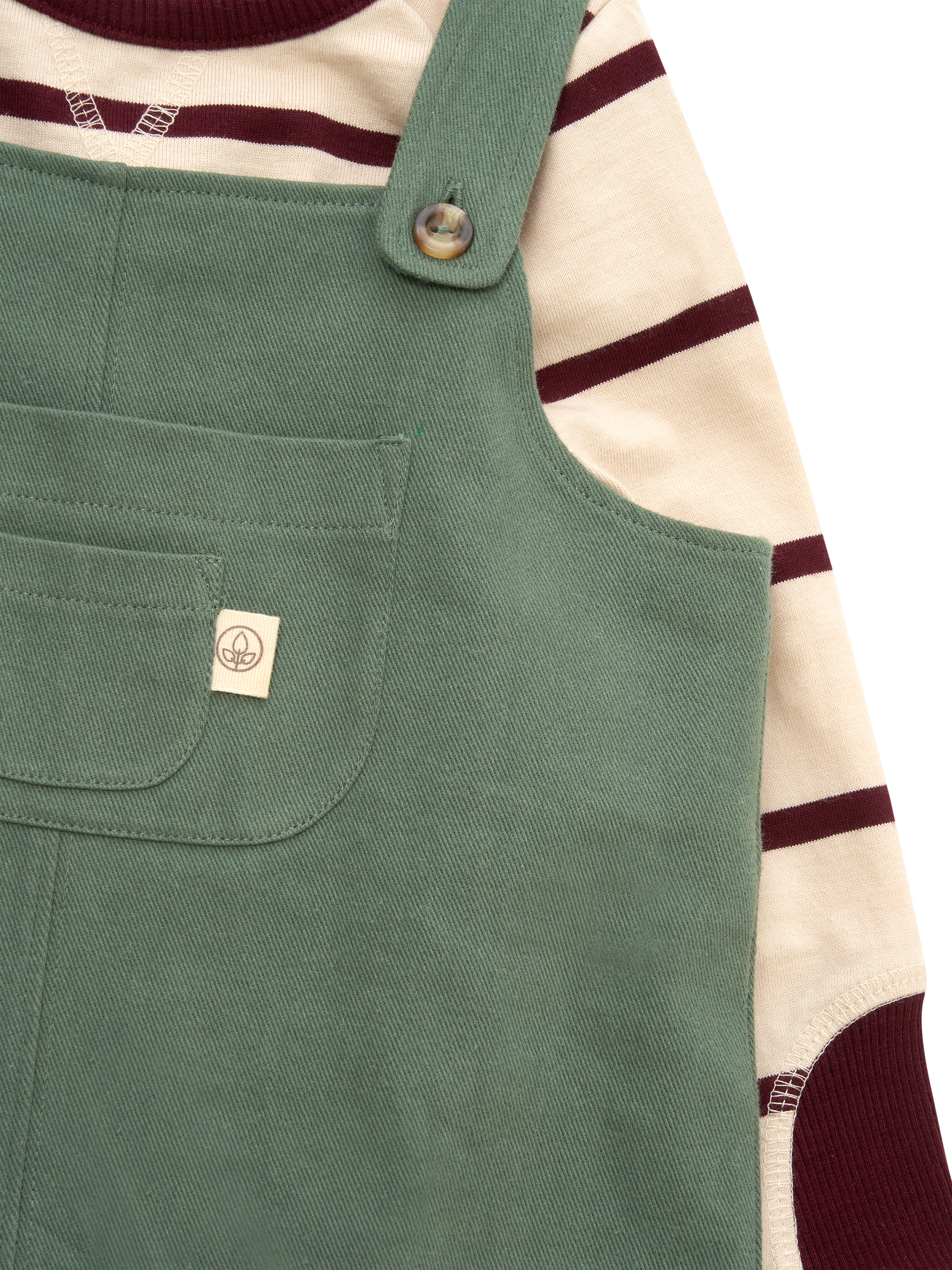 Green twill dungarees paired with a soft striped burgundy and cream top, featuring popper detail at the shoulders and legs for fuss-free changes. Already perfectly styled, your little gent will look just perfect.