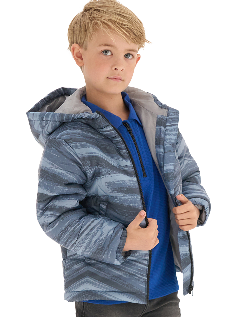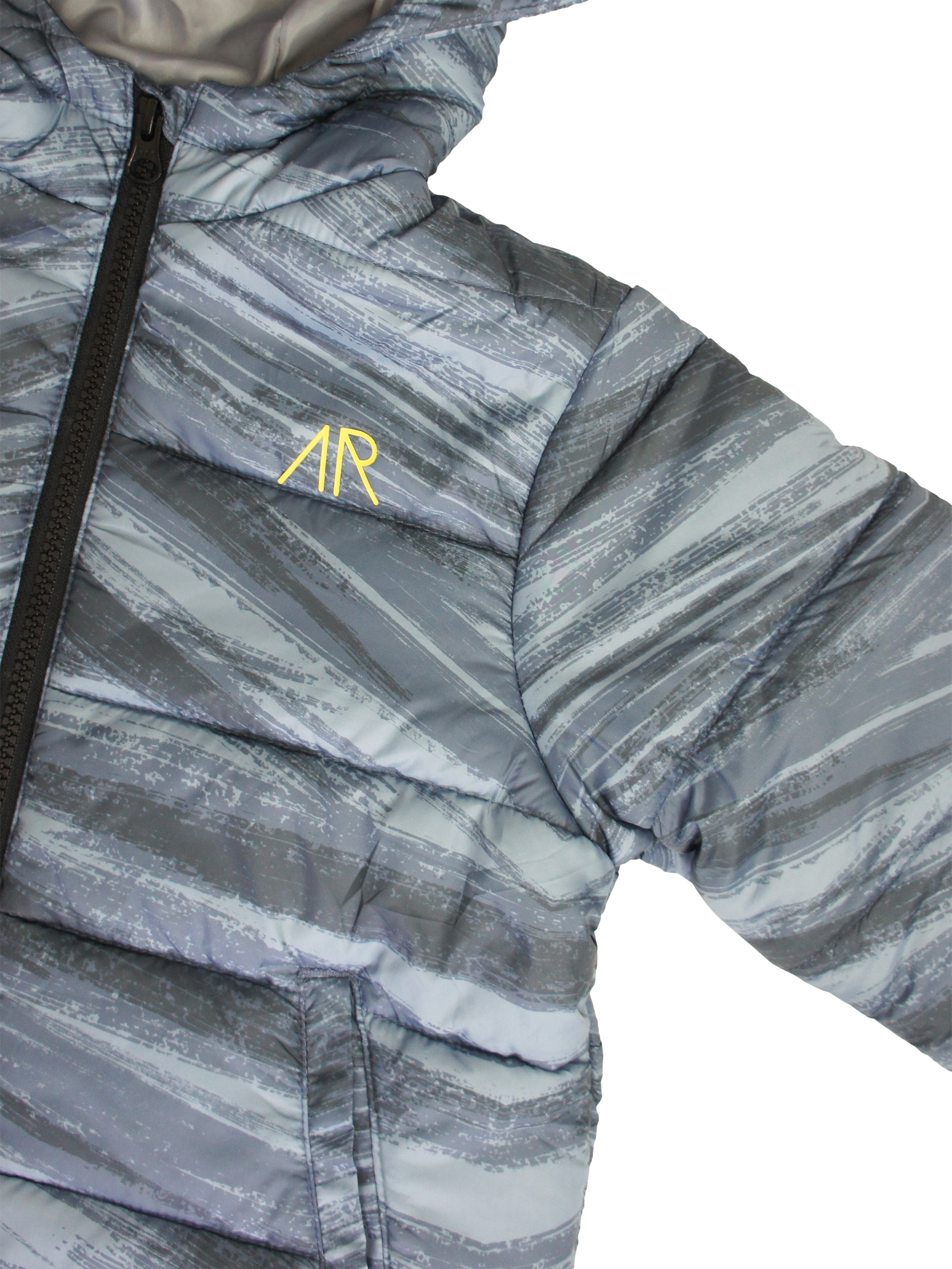 A jacket for all seasons, this performance based fabric puffer jacket features a fabulously unique brushstroke print, sporting a practical hood.