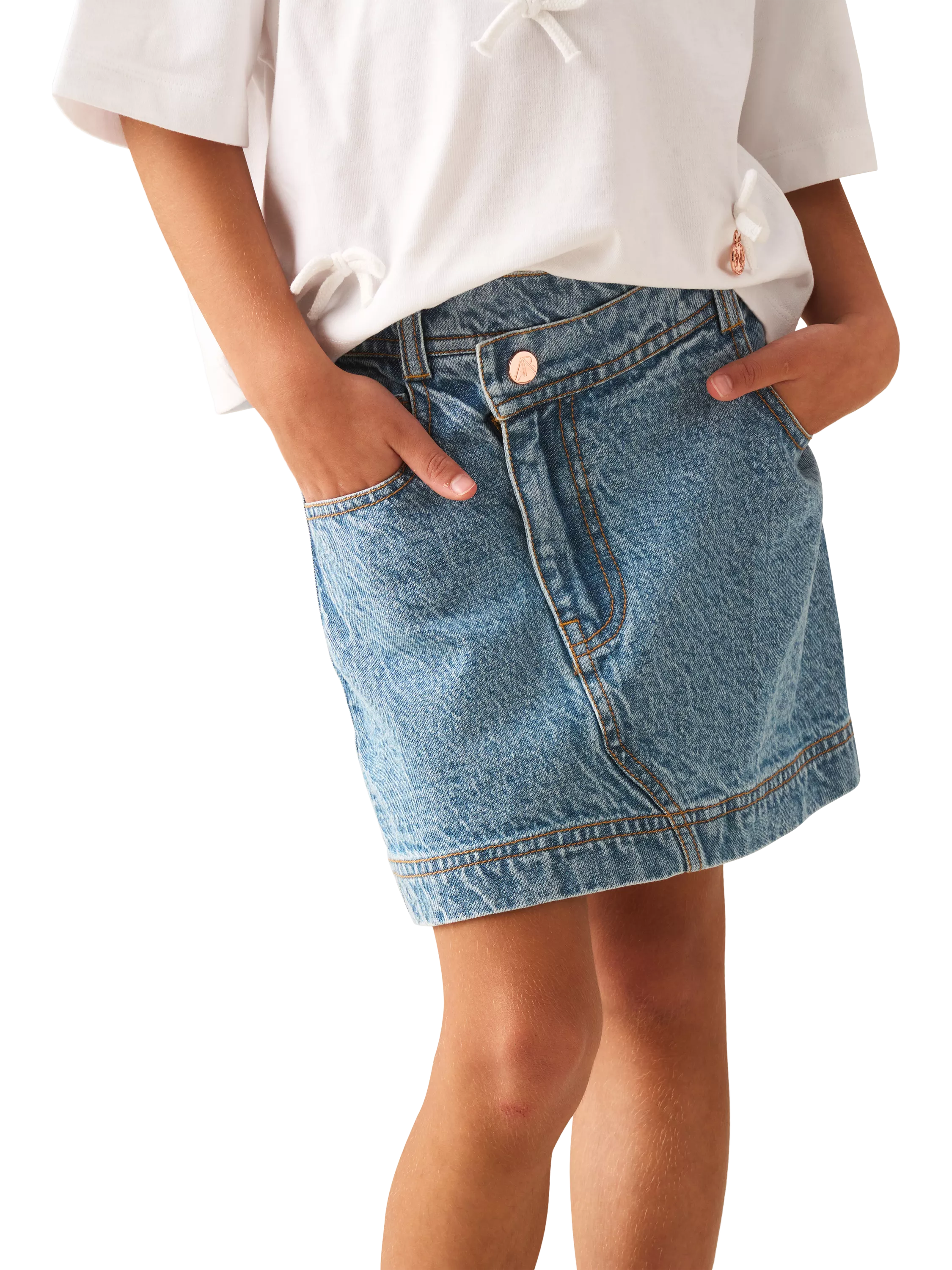 This classic denim mini skirt gets a fun update with an asymmetric waistband detail and comfy adjustable waist – perfect for growing explorers. Designed for every adventure and easy outfitting, it’s the kind of denim she’ll reach for on repeat.
