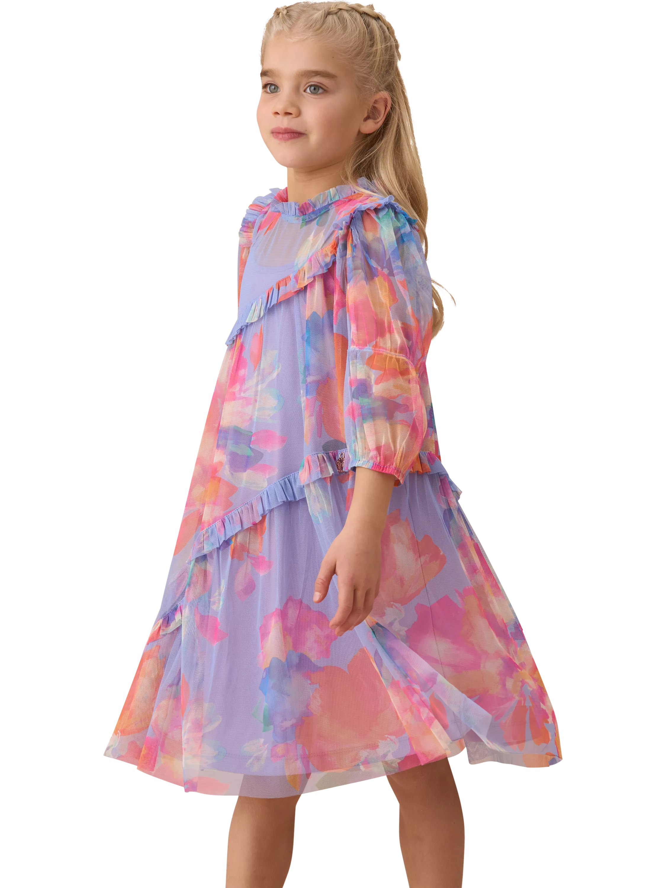 Beautiful oversized blooms printed on a dreamy diaphanous mesh fabric with soft cascading ruffles in a stunning new season colour palette.
