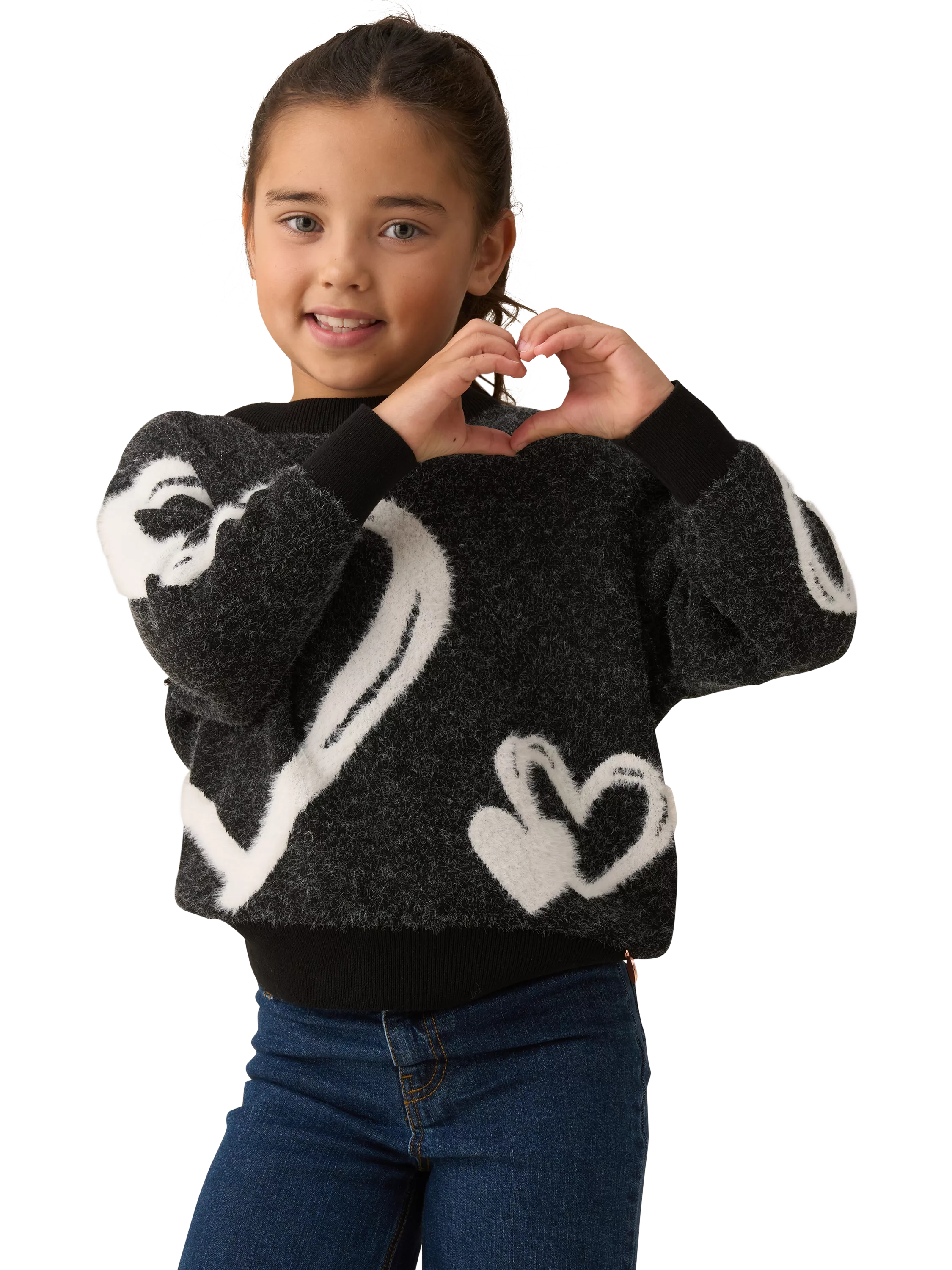 This knit is super soft and fluffy with oversized sketchy hearts in striking monochrome tones.