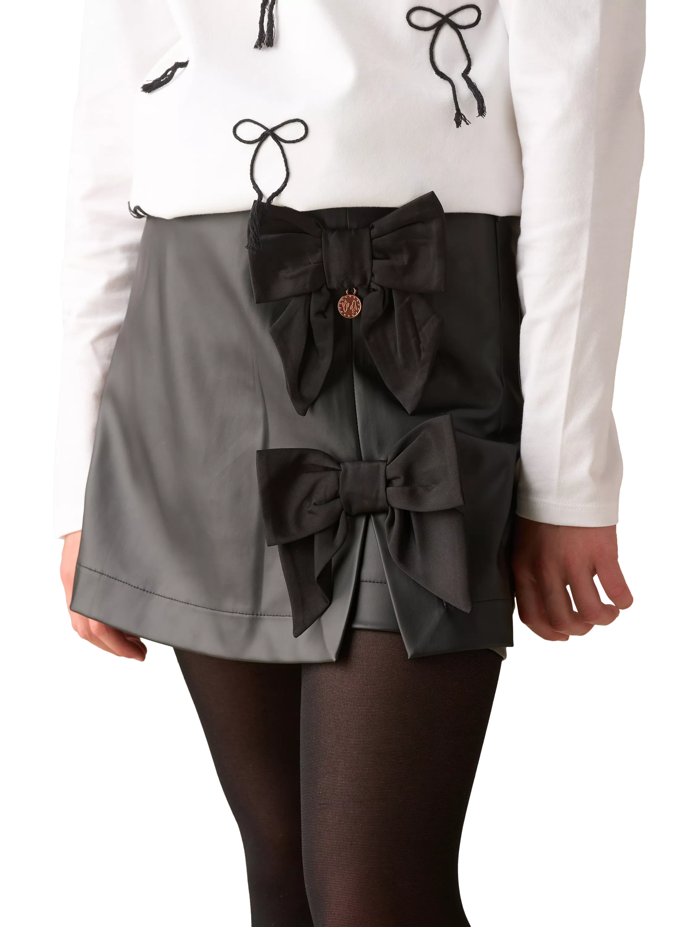 This butter-soft black faux leather skort is made for big adventures. With sweet side bows for extra fun and hidden shorts underneath, it’s perfect for running, jumping, and twirling all day long. Style it your way—from playground cool to party-ready, perfect for the festive season.