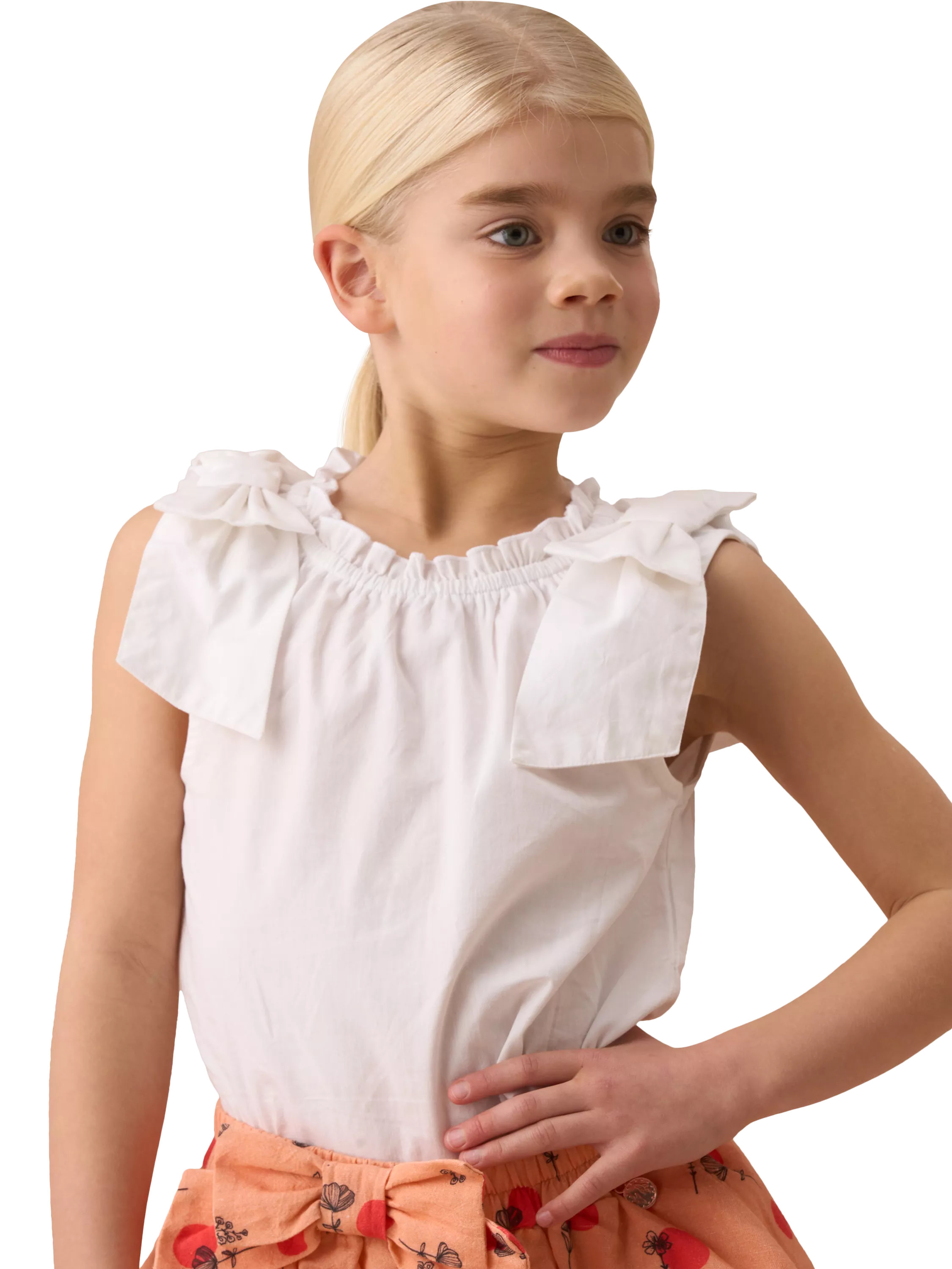 A crisp white cotton top with statement bow detail at the shoulder.