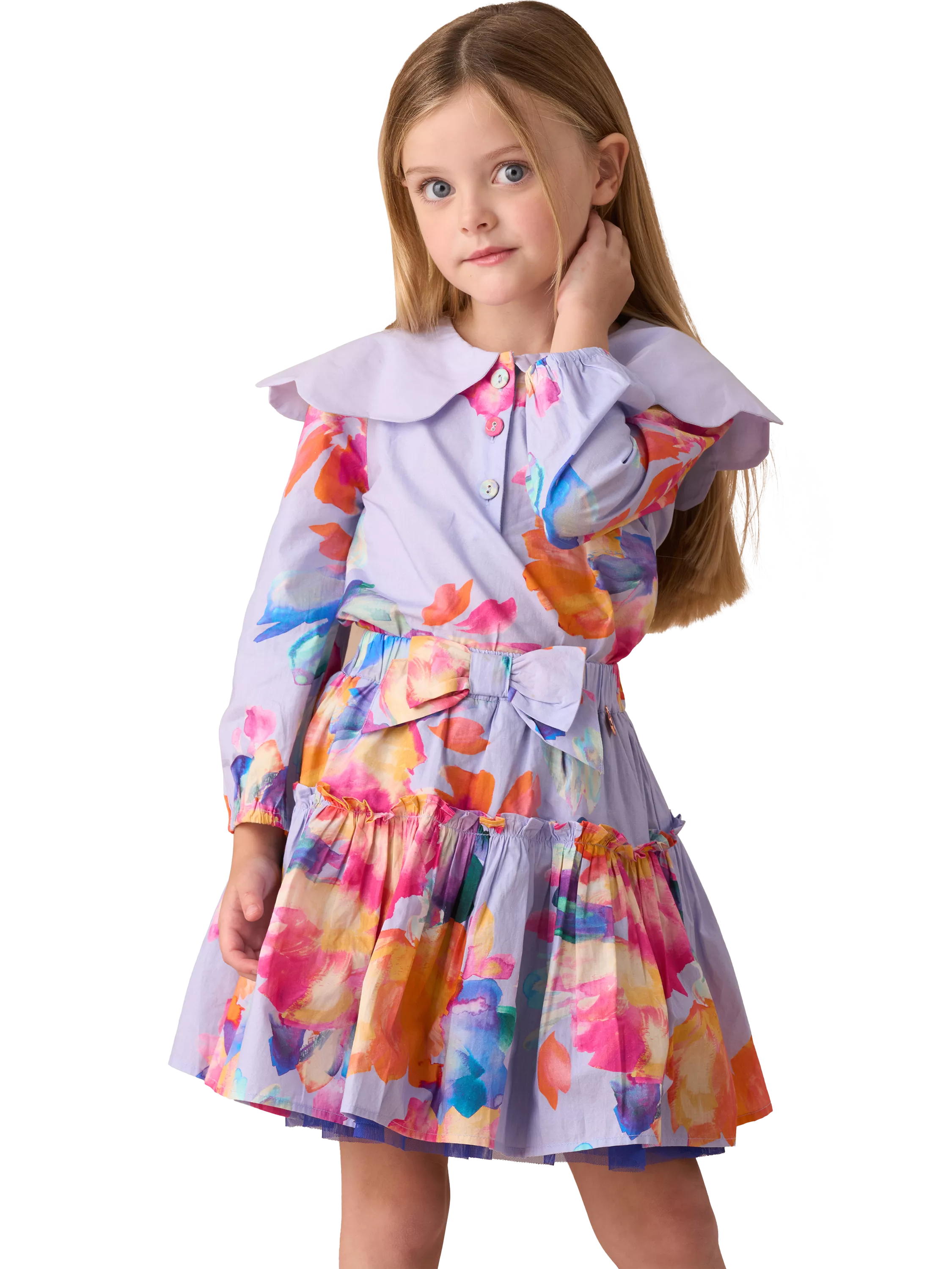 Stunning statement blouse with oversize scallop cape collar detail in a vibrant floral print. Pair with matching skirt for outfit perfection.