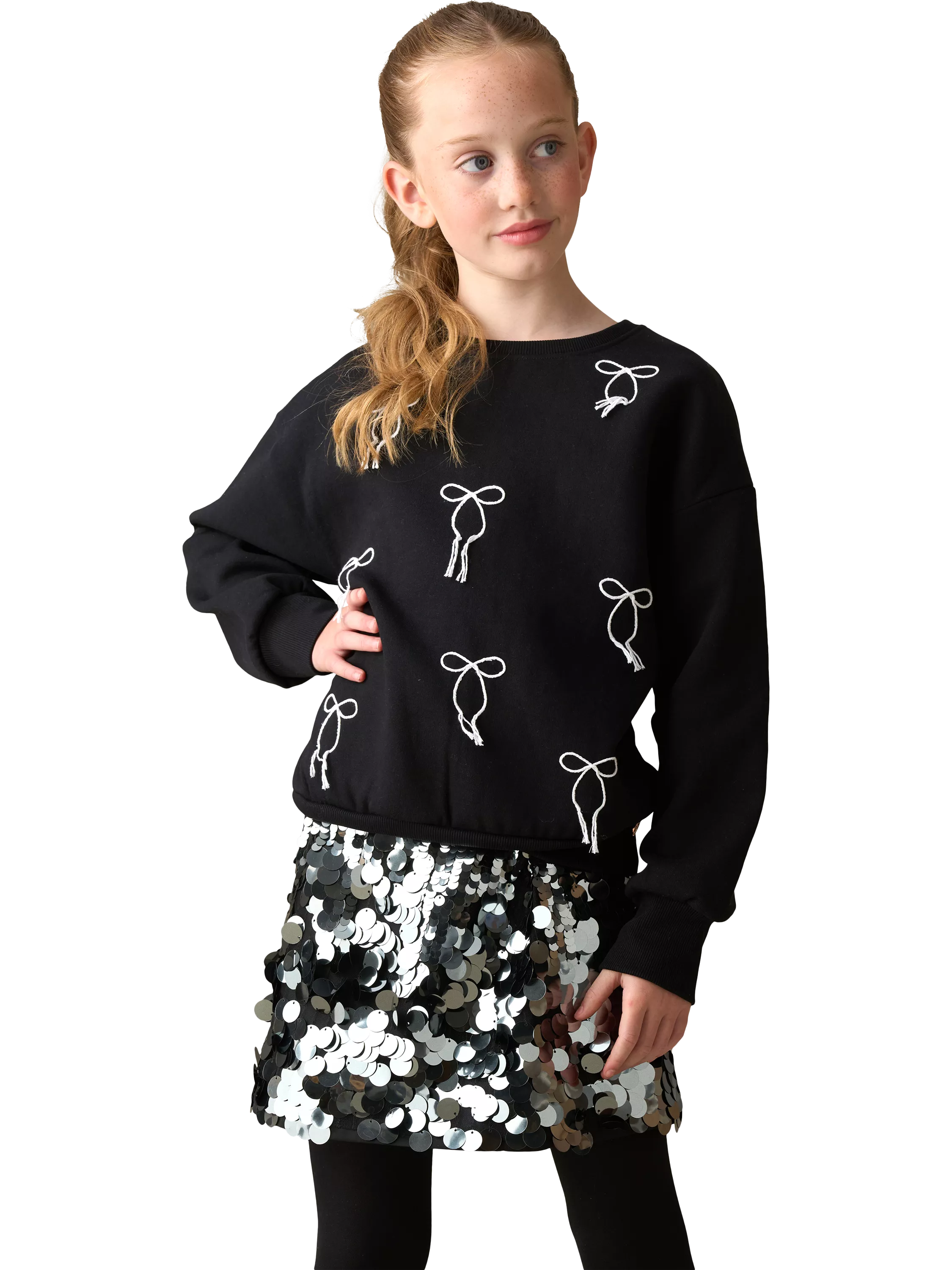 Bow-tiful. Comfy meets cute in this super-soft black sweatshirt, scattered with fun embroidered bows. It's the perfect everyday layer with a playful twist — easy to dress up, lounge in, or mix and match for standout style with zero fuss.