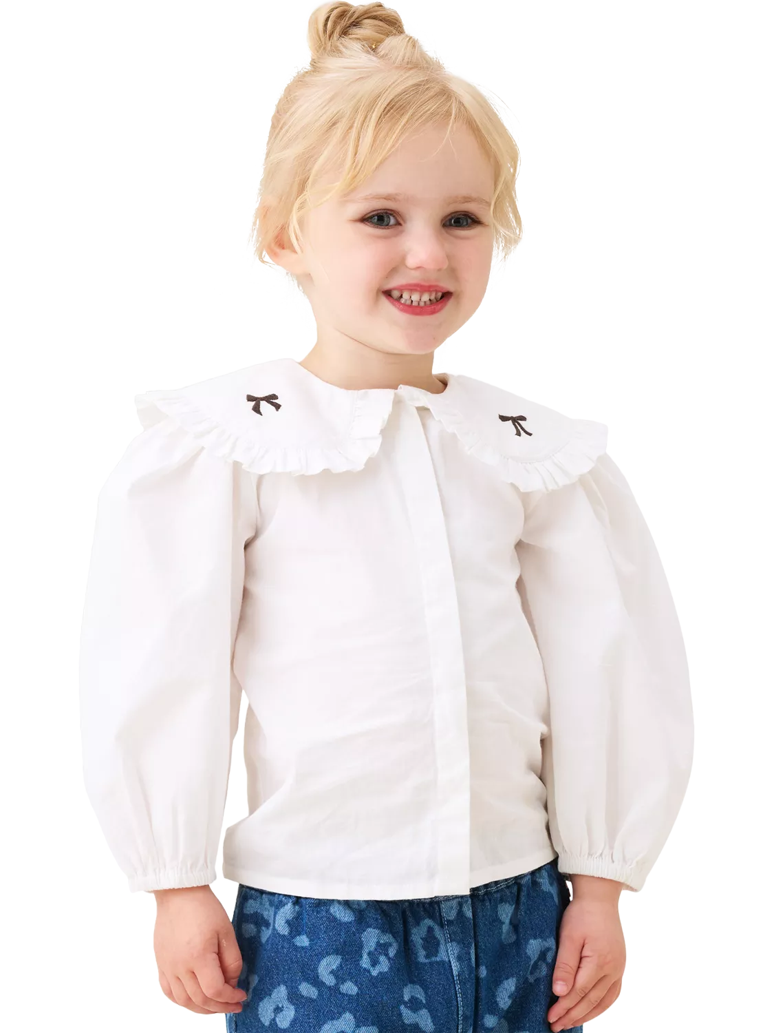 For the tiniest of trendsetters, this crisp white shirt features blouson sleeves and a statement collar, finished with delicate embroidered bows. Crafted from 100% cotton.