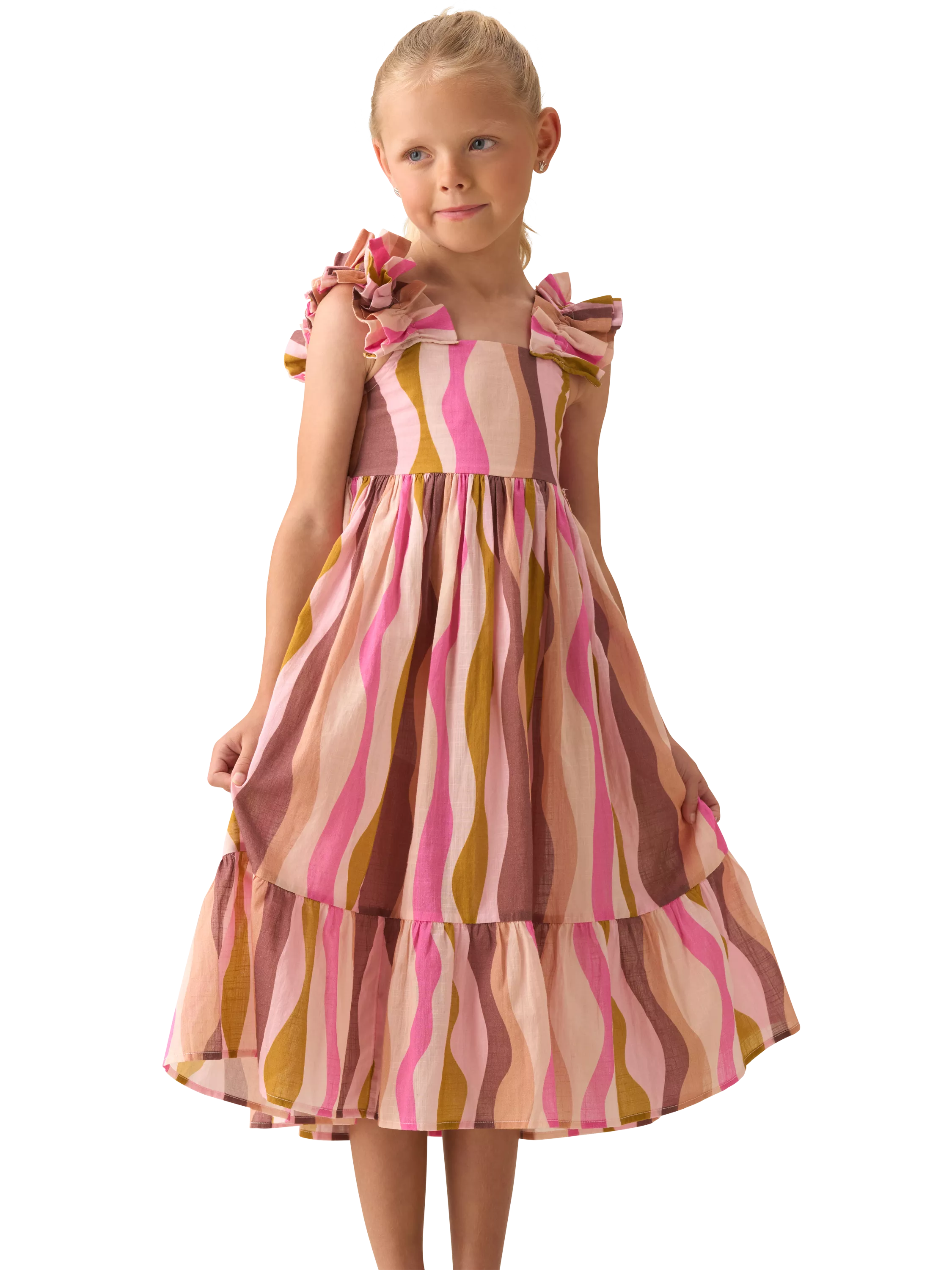 This vibrant wave-print dress is bursting with colour, just right for sunshine-filled days. Making a bold summer statement it features ruffled shoulder straps. The perfect dress for beach holidays!