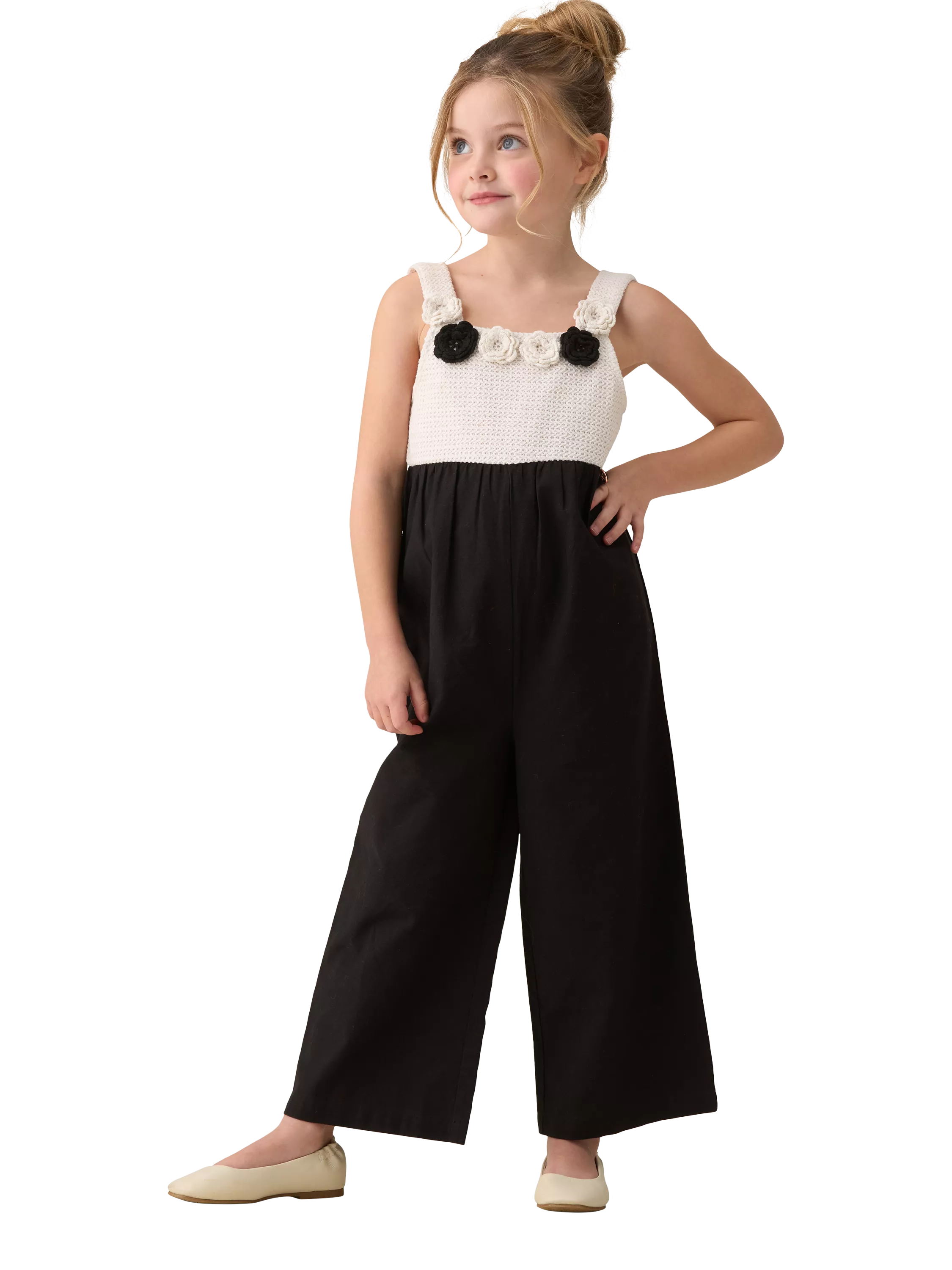 Oh sew grown up! Crafted from a cotton-linen blend, this crochet jumpsuit features a delicate crochet yoke with scrumptious floral details. In timeless monochrome black, it's a chic and versatile piece.