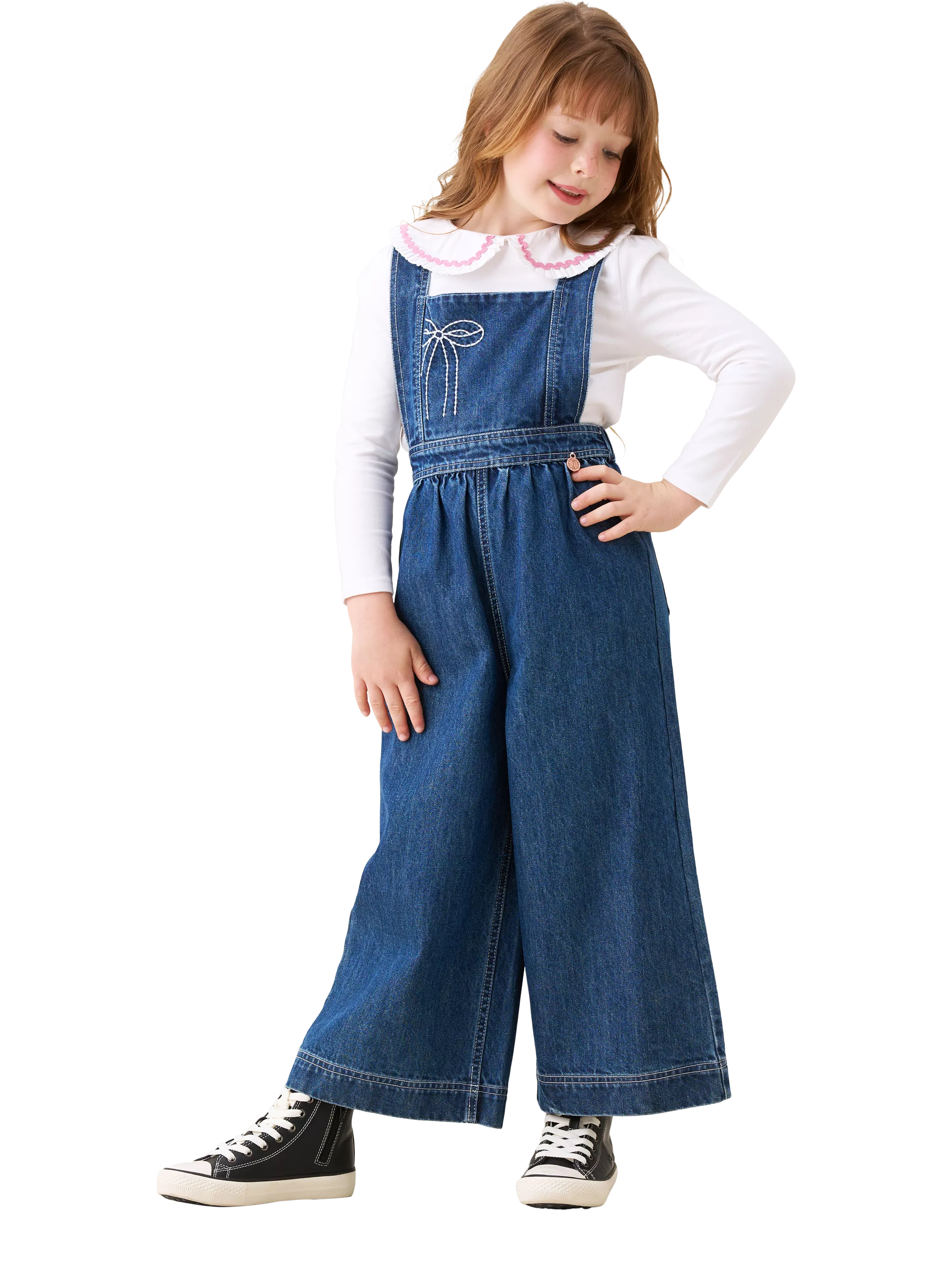 These mid-wash denim dungarees feature crisp white stitching and delicate bow embroidery on the pockets. With a wide-leg and cross-back adjustable straps, they’re as stylish as they are practical. Layer with a collar top for an effortlessly chic look!