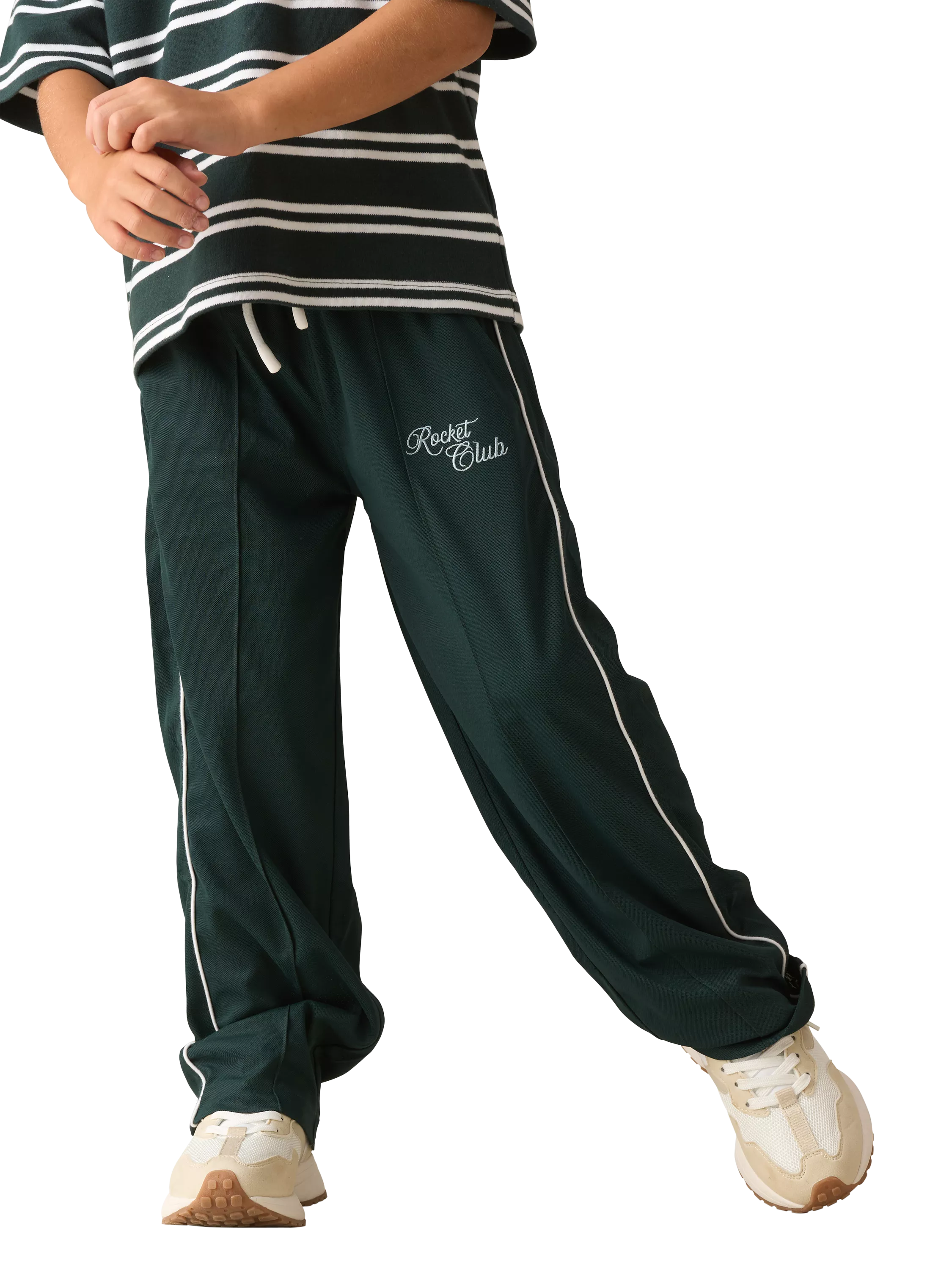 These forest green joggers are cut in a relaxed fit and crafted in pique fabric with contrast piping for a classic athletic look. Featuring an adjustable drawstring waist and Rocket Club embroidery, they’re practical, durable, and perfect for everything from active play to laid-back days.