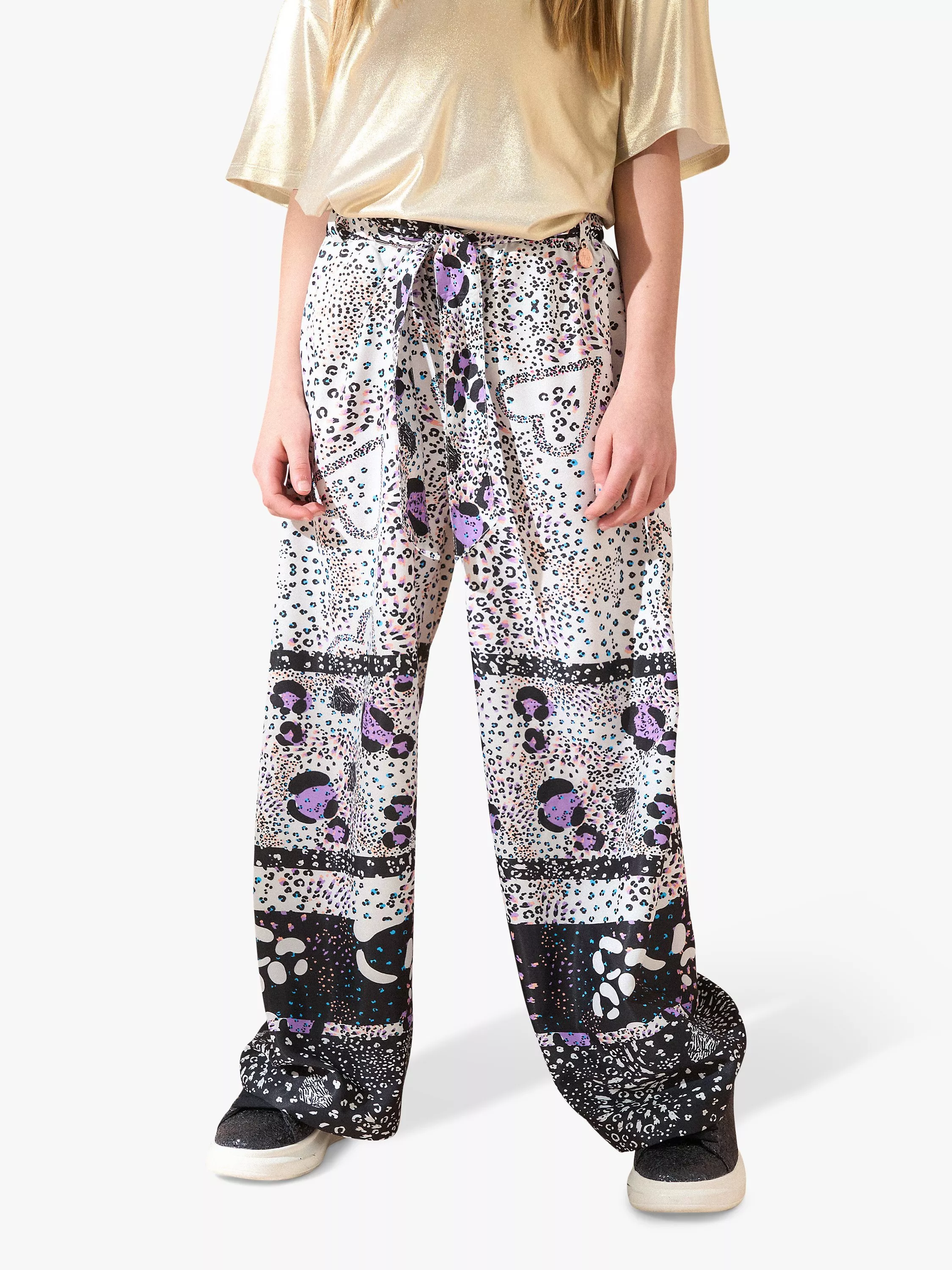 Cut with a super-wide leg and designed in a bold multi-print with animal details, these statement trousers are perfect for weekend adventures. They have a comfy elasticated waistband with a self-tie belt.