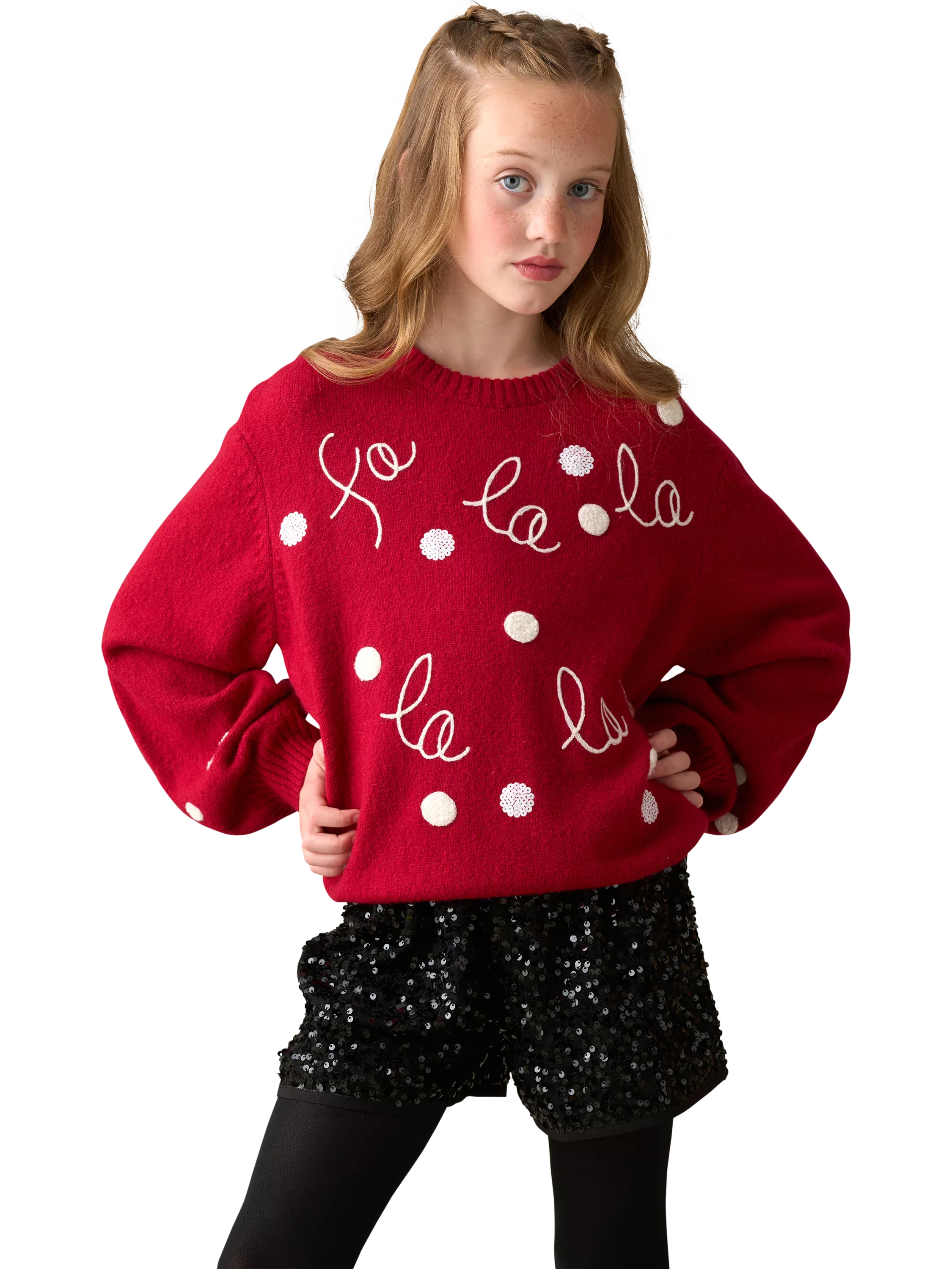 Fa La La Fabulous! Get into the holiday spirit with this jolly red knit, featuring playful embroidered “fa la la” script, fluffy pom-poms, and sparkling sequin snowballs. Soft, cosy, and bursting with festive cheer, it's perfect for party days, cosy nights, and everything merry in between.