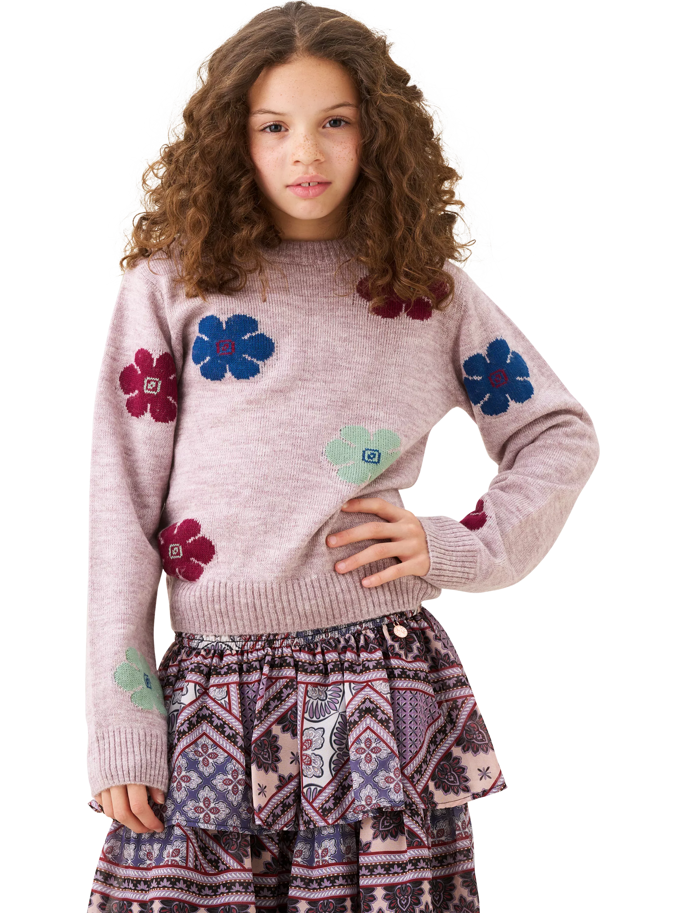 Colder weather is the perfect excuse to update your knitwear. This super soft jumper in mauve is crafted from fluffy yarn and sprinkled with a playful flower intarsia design. Guaranteed to brighten up even the greyest of days.