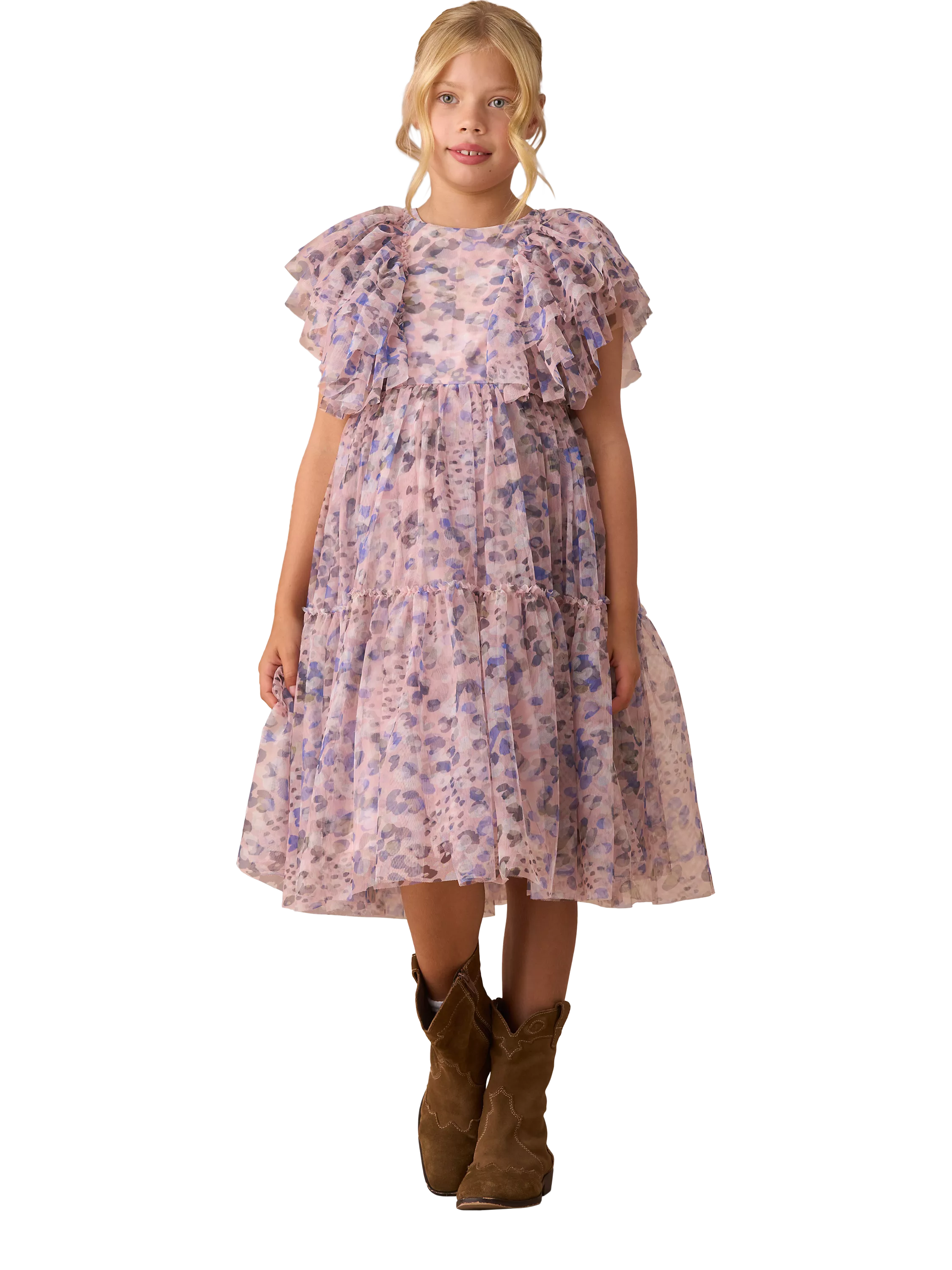 Layers of soft mesh in a pretty abstract print, cut into a tiered silhouette with statement ruffle sleeves and a full swishy skirt.