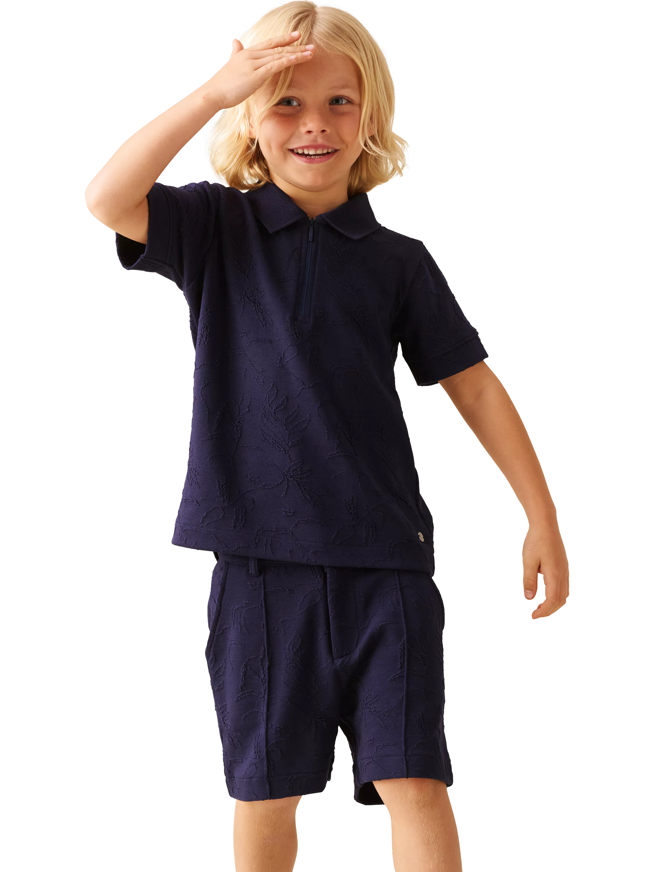 This jacquard-textured polo is designed with a neat collar and zip fastening, giving it a refined finish. Paired with the matching shorts, it makes a stylish set that’s perfect for special occasions.