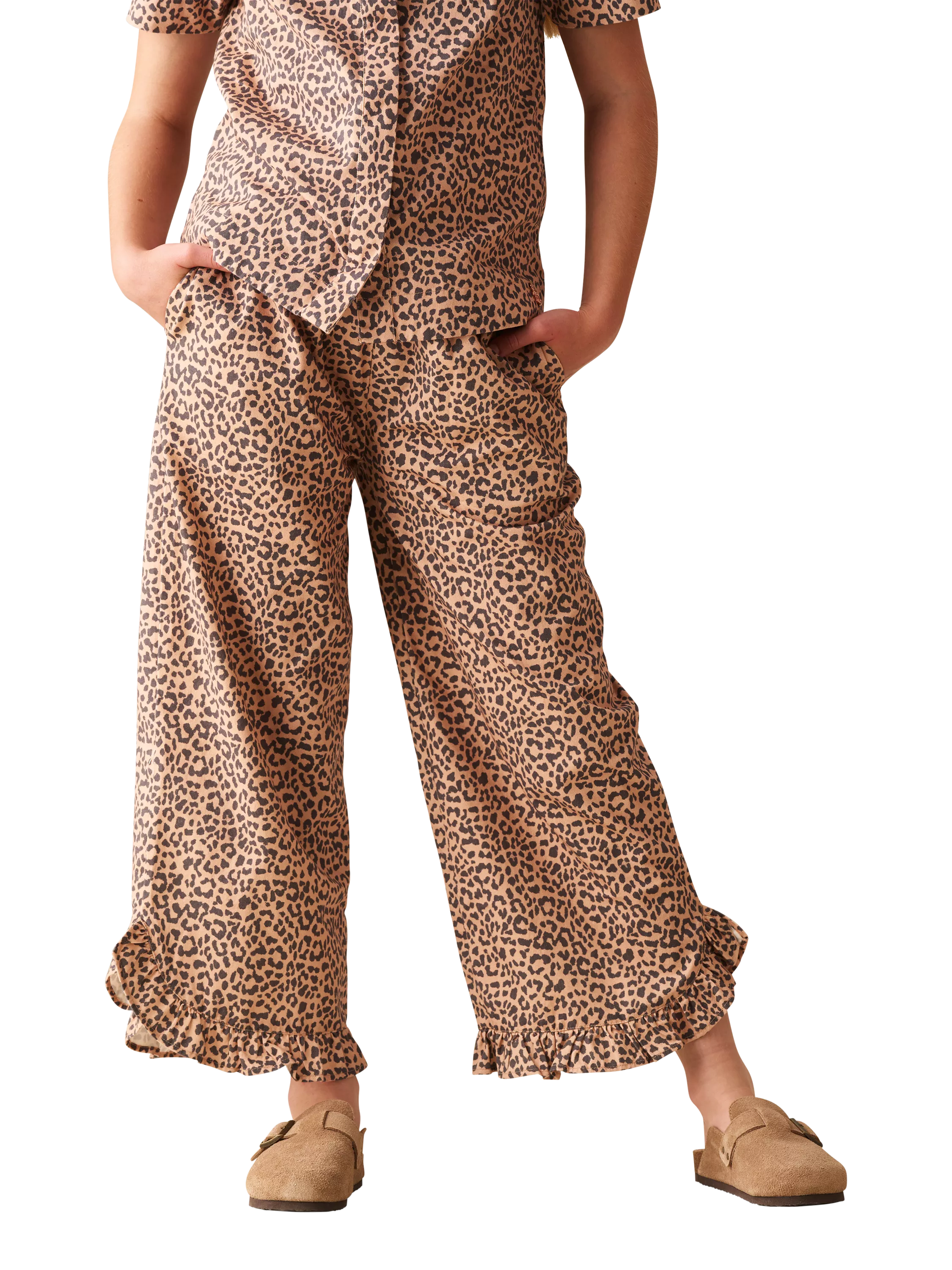 Featuring bold leopard print in cropped length with frill details, these trousers are fierce and totally fabulous. Pair it with the matching blouse for a wild and wonderful look that roars with personality.