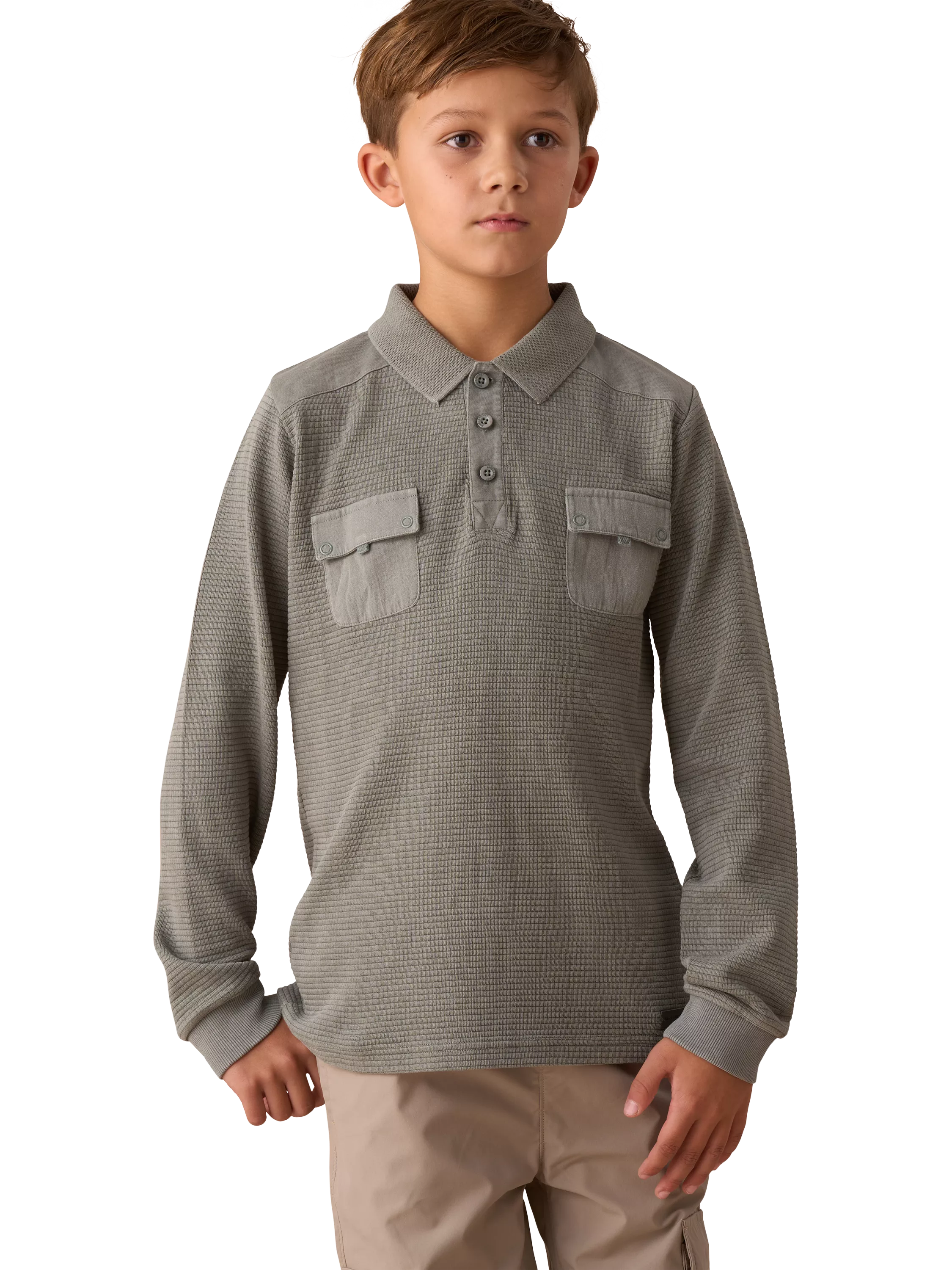 Revive their summer wardrobe! This long-sleeve textured polo shirt features a chest pocket detail in soft green and is washed for authenticity.