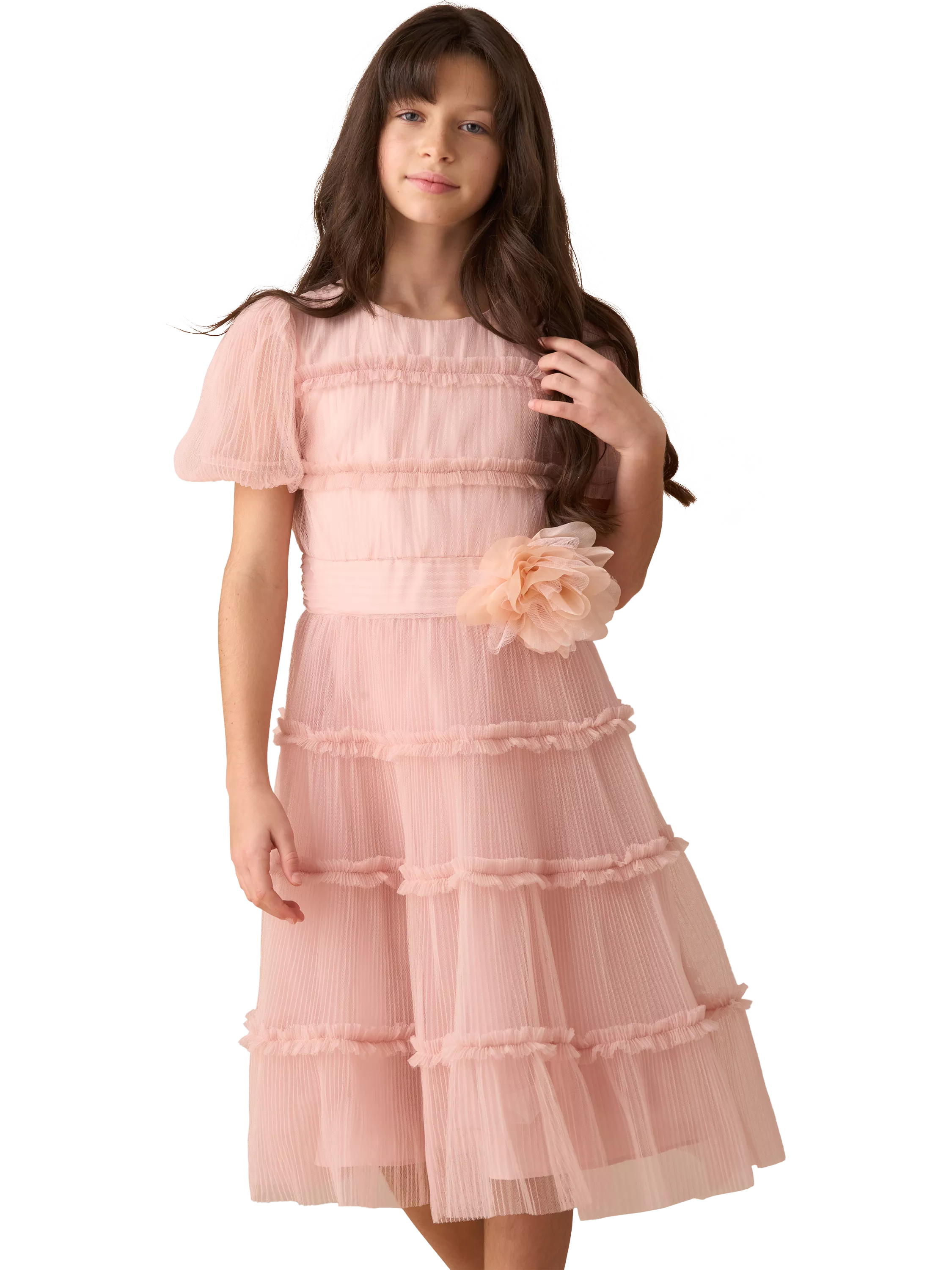 A stunning tiered silhouette with a gentle puff sleeve, the standout feature is the fabulous oversized corsage at the waist.
