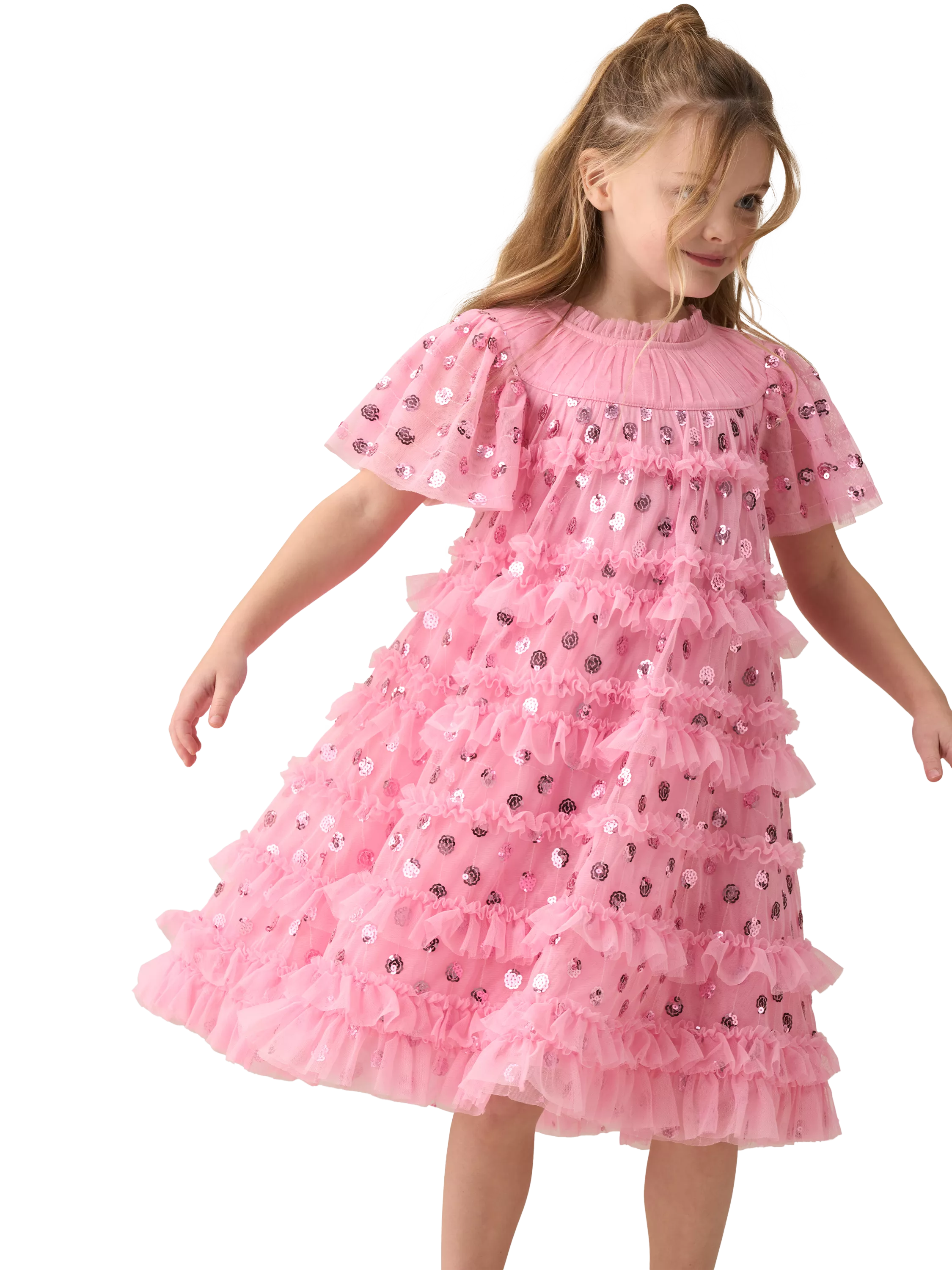 Cue flashbulbs! Get ready to dazzle in this pretty pink dress, featuring a longer-length silhouette and a skirt that's brimming with volume and tiers. Scattered with shimmering sequins, it's perfect for twirling the night away.