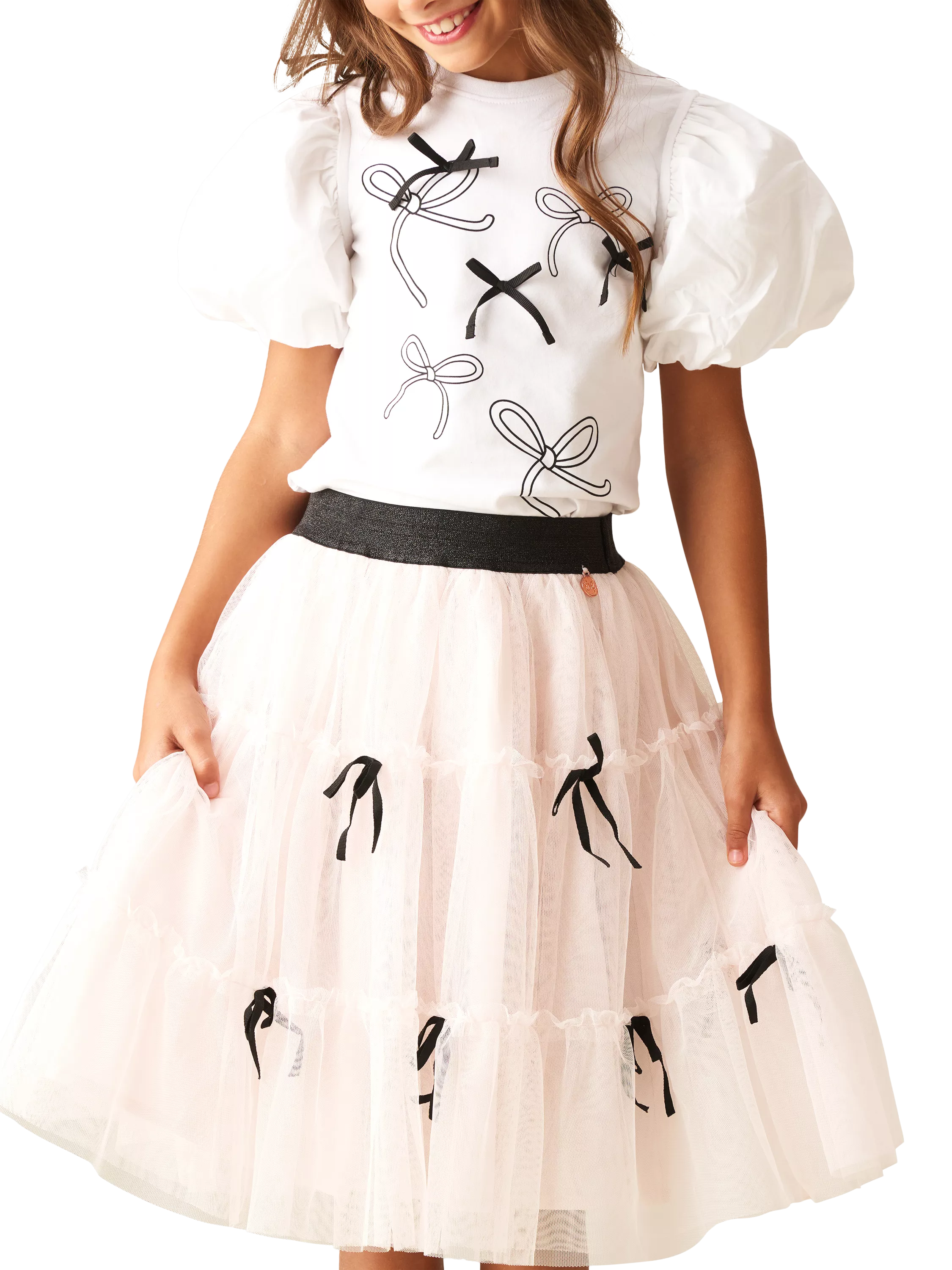 This soft pink mesh skirt is sprinkled with mini black bows and finished with a sparkly black metallic waistband for a dash of glam.