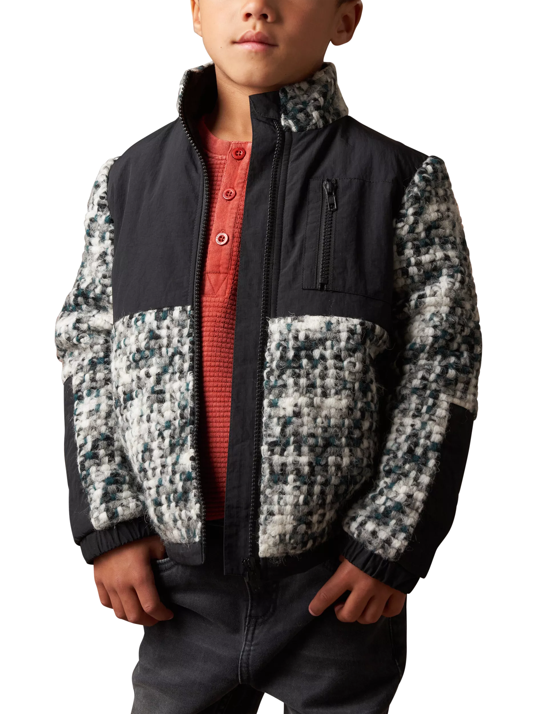 A lightweight and cosy jacket, made from a wool blend, boucle fabric with a super-soft jersey lining. It has a cool, colour-block design and features a sporty zip pull fastening and chest zip pocket detail. It's an ideal layer for weekend activities.