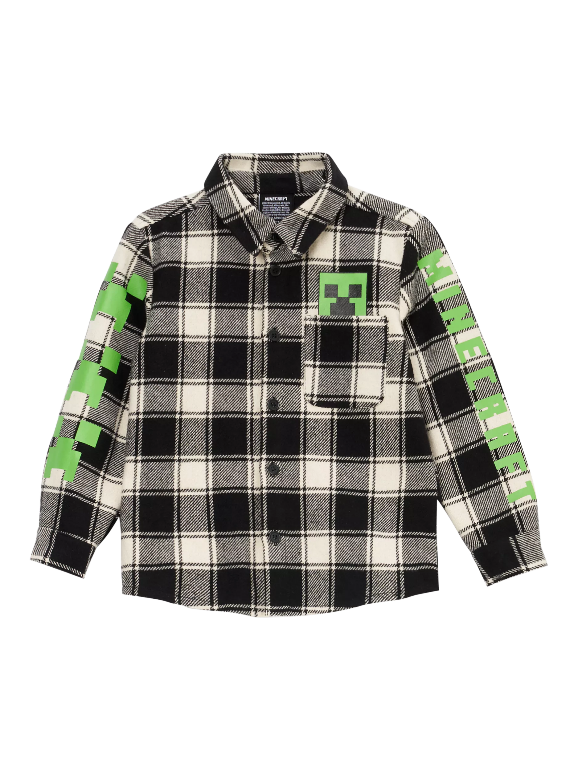 This super-soft Minecraft branded shirt, crafted from a brushed cotton check fabric is a collaboration dream. It features graphic sleeve and front pocket creeper details.