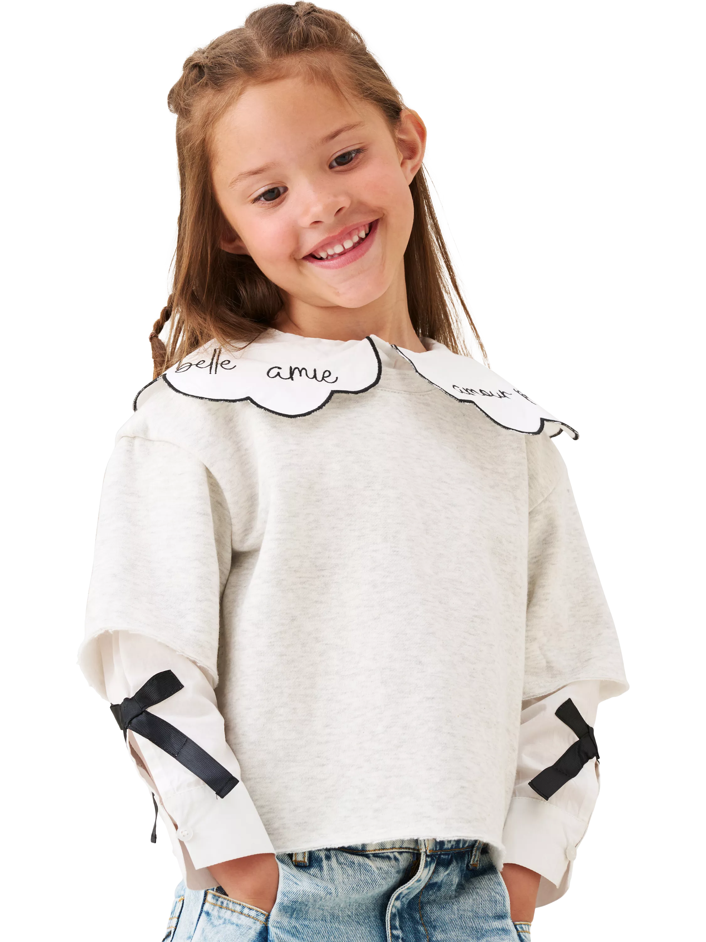 Belle amour! Let us do the styling for you with this super-soft layered sweatshirt featuring a statement scalloped collar and mock shirt sleeves. The bow details add the perfect Parisian touch for effortlessly chic vibes.