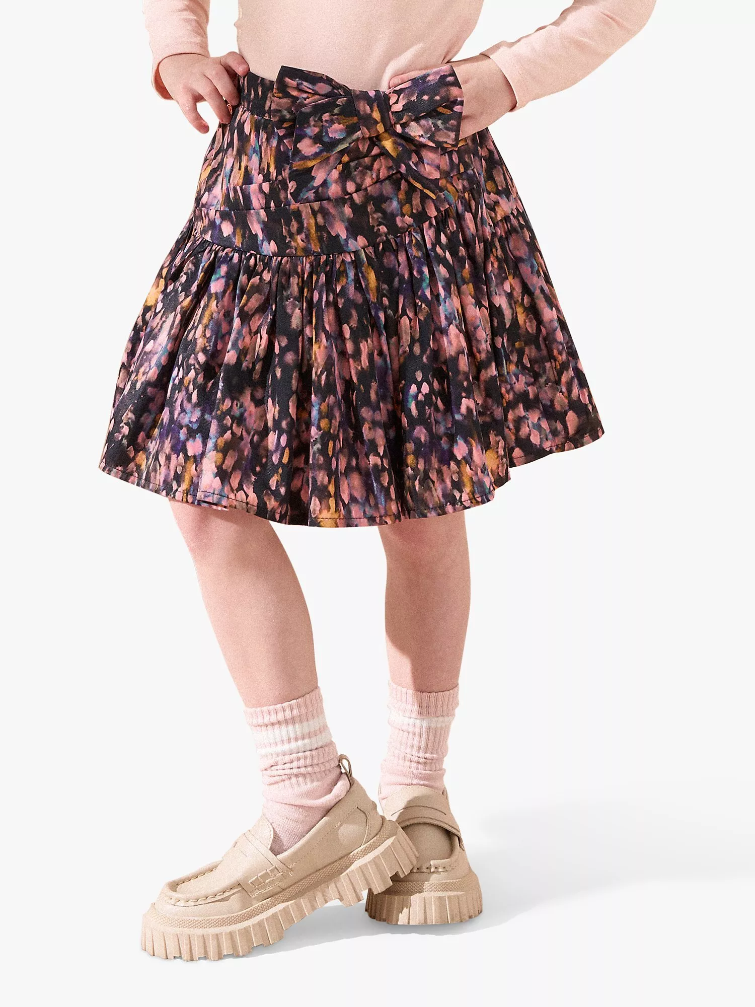 Created from super-soft printed viscose and layered with delicate mesh to add volume, this statement skirt is finished with ruching detail and a bow at the waist. Easy to style with a plain tee or long-sleeve top for an easy, trans-seasonal outfit.