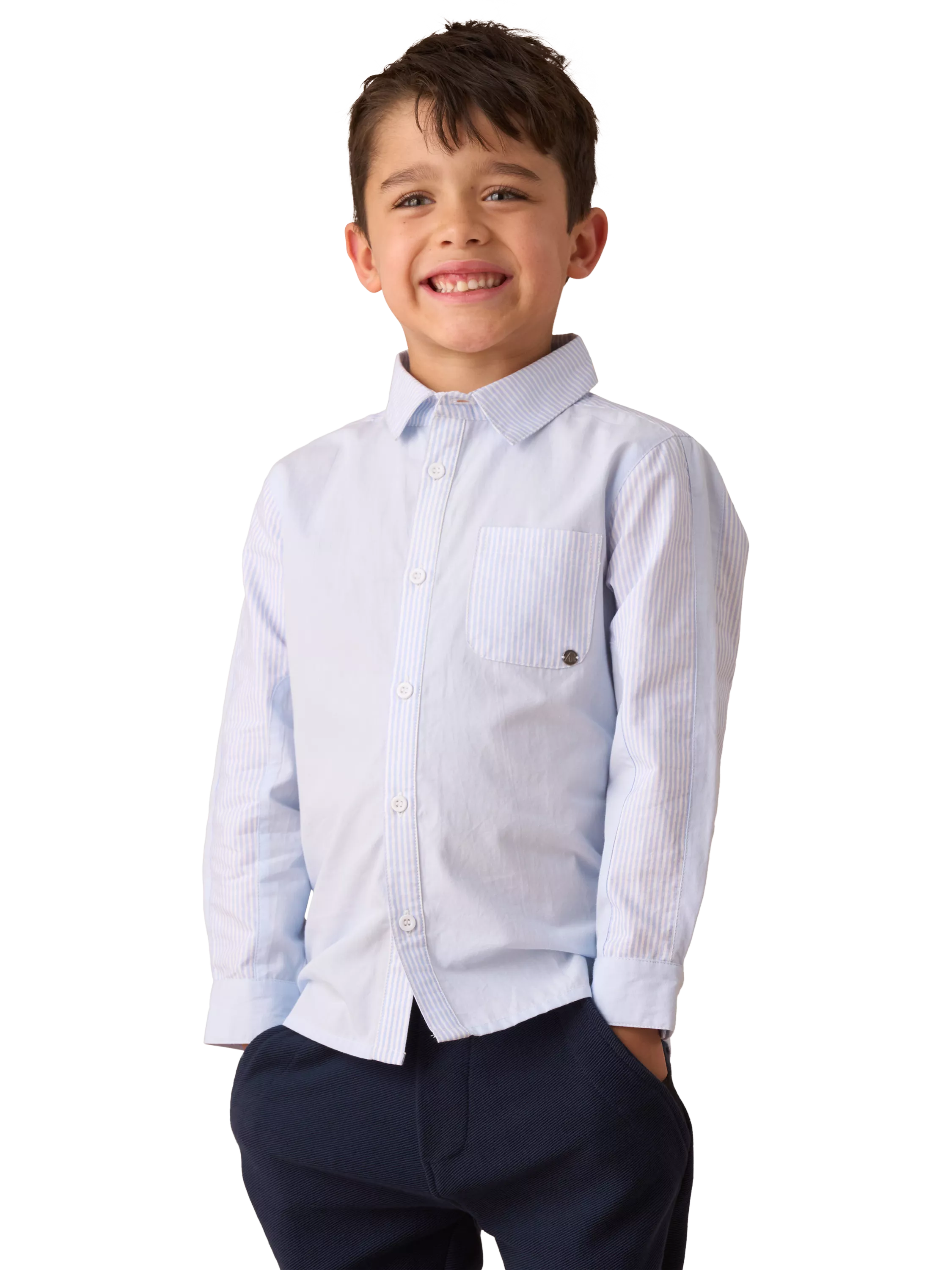 Classic, smart and casual - this tailored cotton shirt can really do it all. Featuring a smart mix of stripes in a classic blue colour palette, Angel & Rocket have re-mixed the classic stripe shirt in their true style.