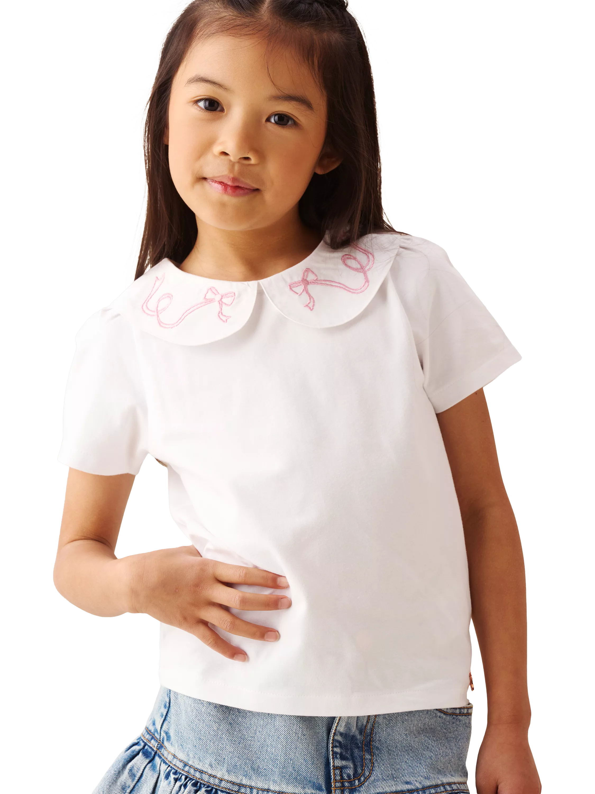 This classic jersey top is elevated with a Peter Pan collar embroidered with playful ribbon details.