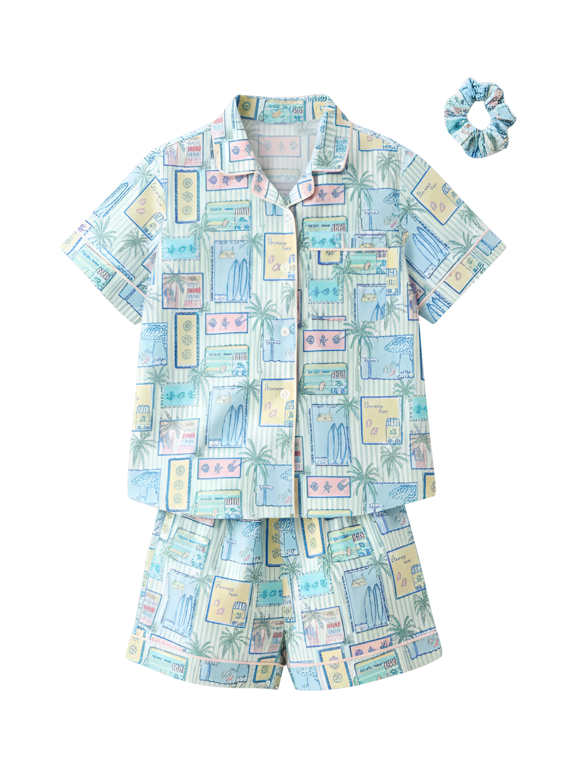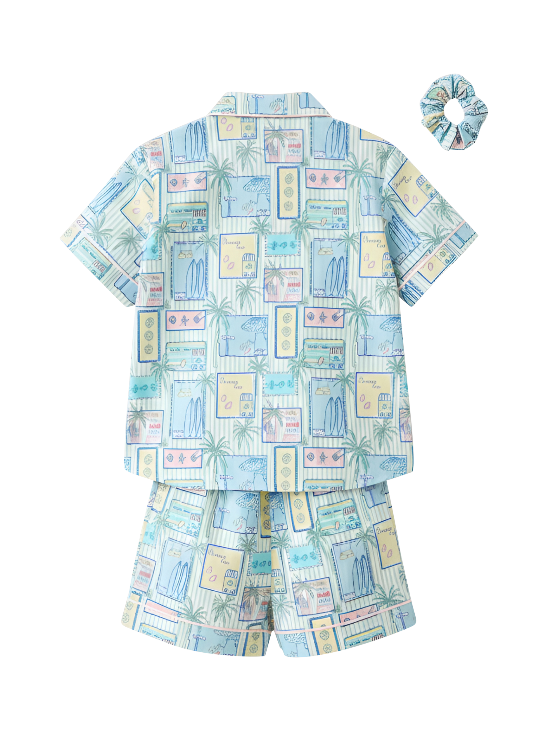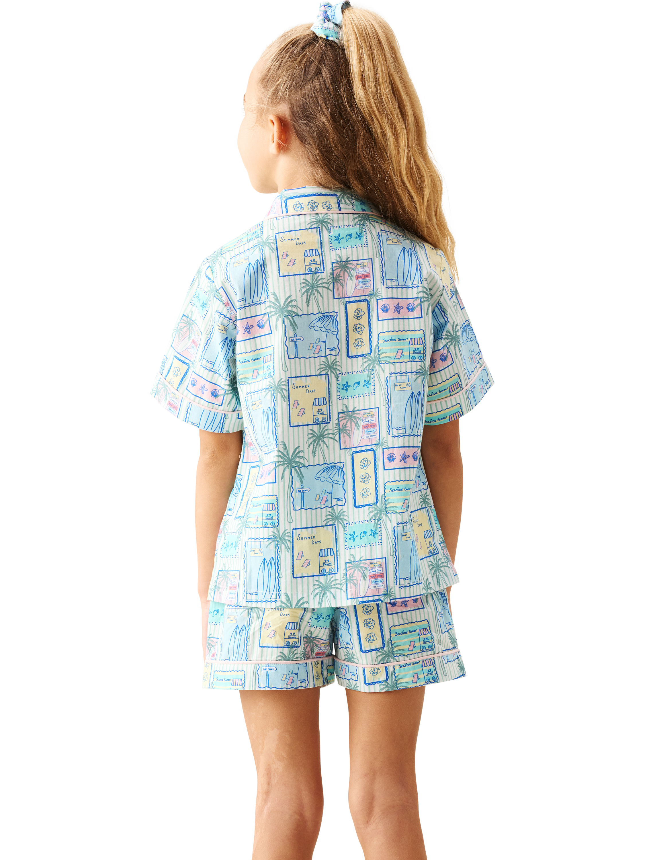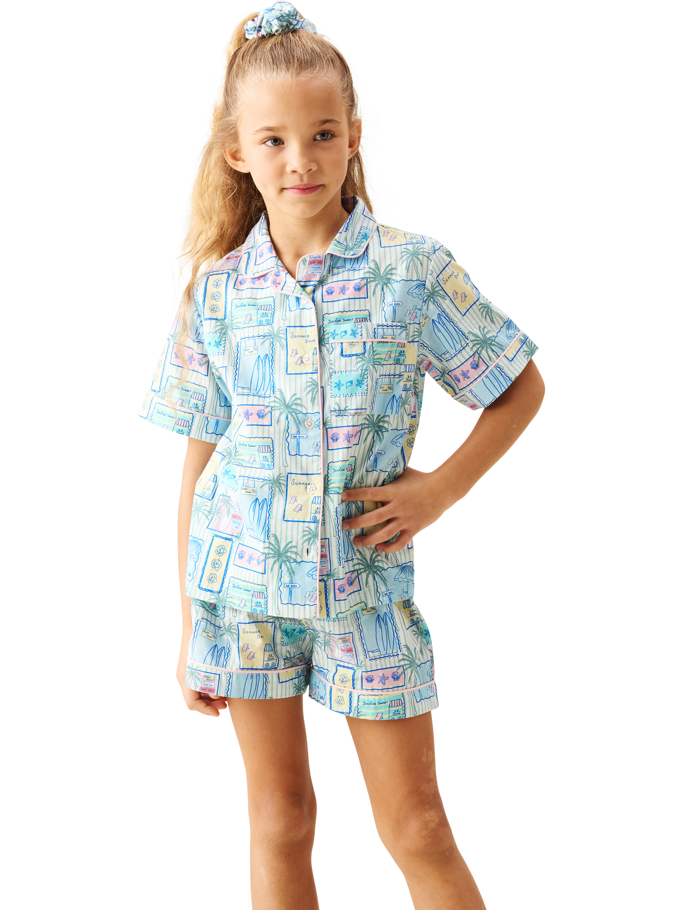This soft cotton PJ set is made for summer nights and comfy mornings, featuring a playful postcard print. Lightweight and breathable, it’s just right for sleepovers, story time, and sweet dreams away.