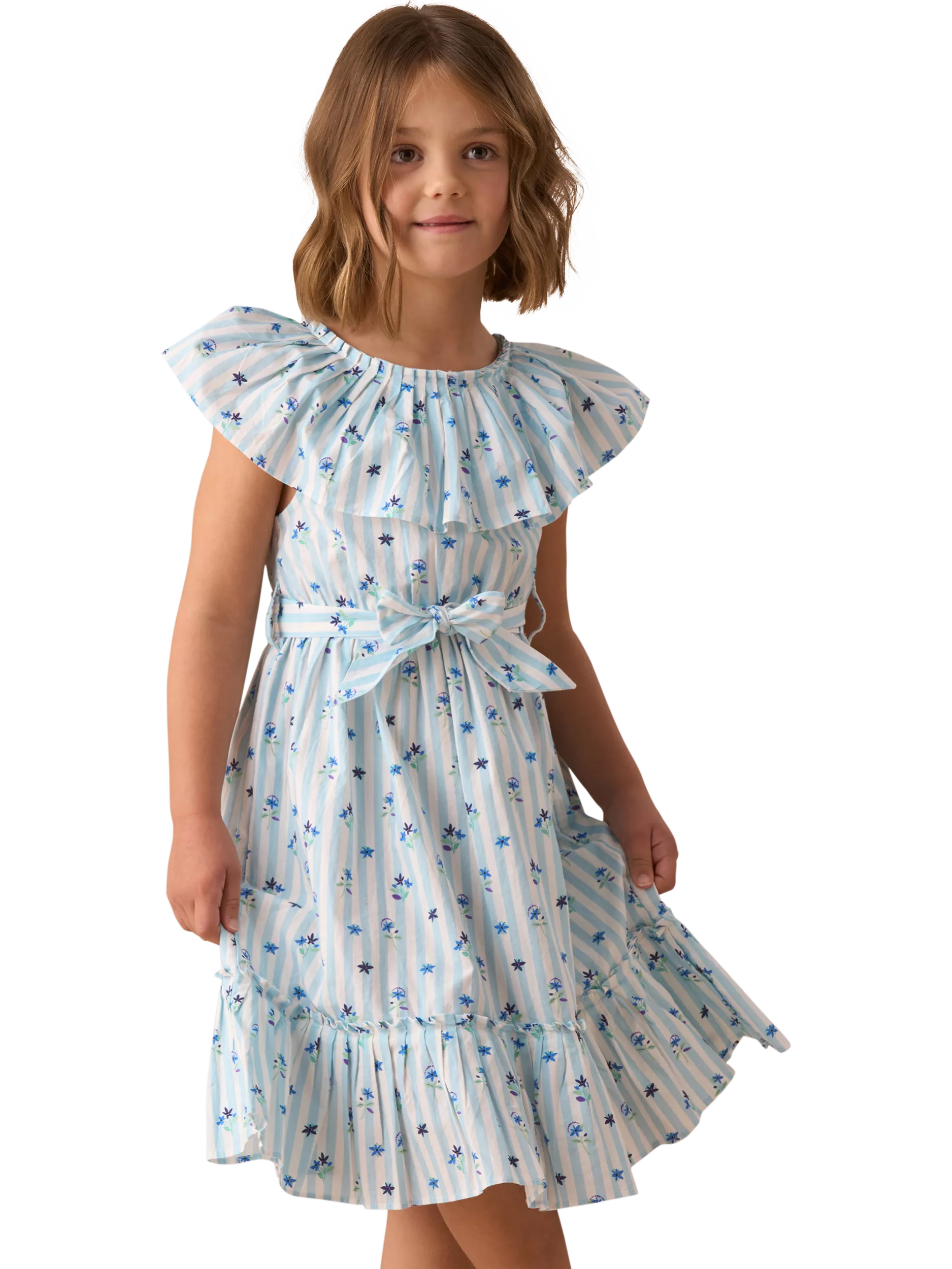 This dress features a beautiful all-over floral print on a fresh striped background with a pleated statement collar and tie-waist sash at the front.
