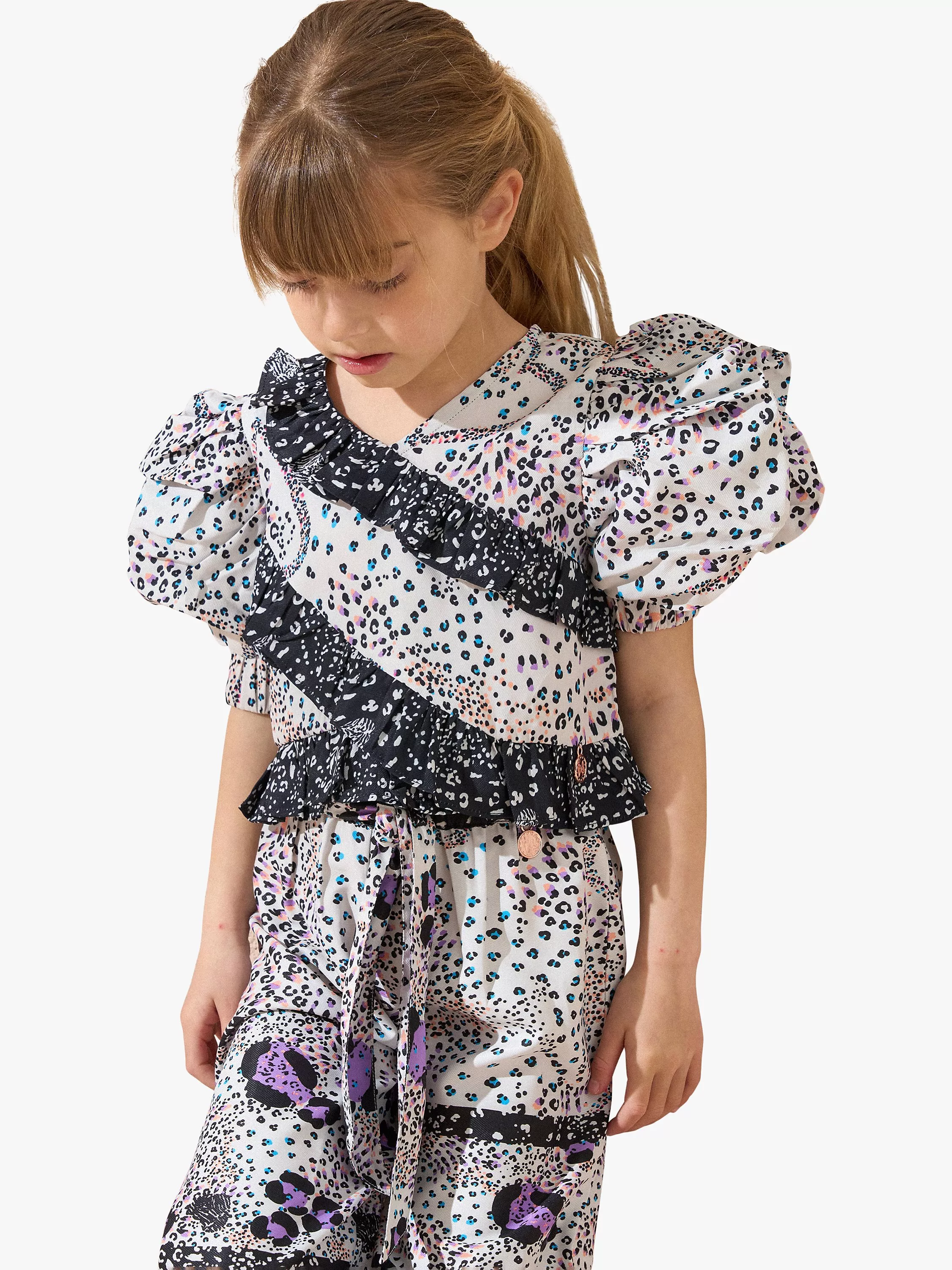 This statement top is designed with playful ruffles, a vibrant animal print and puff sleeves.